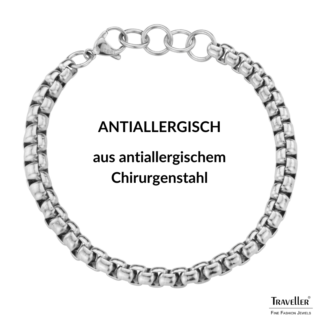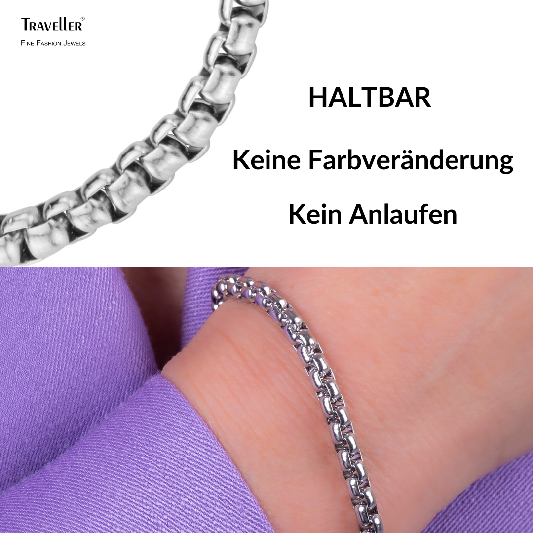 Silberne Farbe und ein luxuriöser Look machen dieses Armband von Traveller zu einem eleganten Accessoire. Das Edelstahlarmband besteht aus kurzen, kleinen silberfarbenen Gliedern. Das Armband ist 21 Zentimeter lang und wiegt 15 Gramm. Ergänzen Sie es mit der passenden Collier.