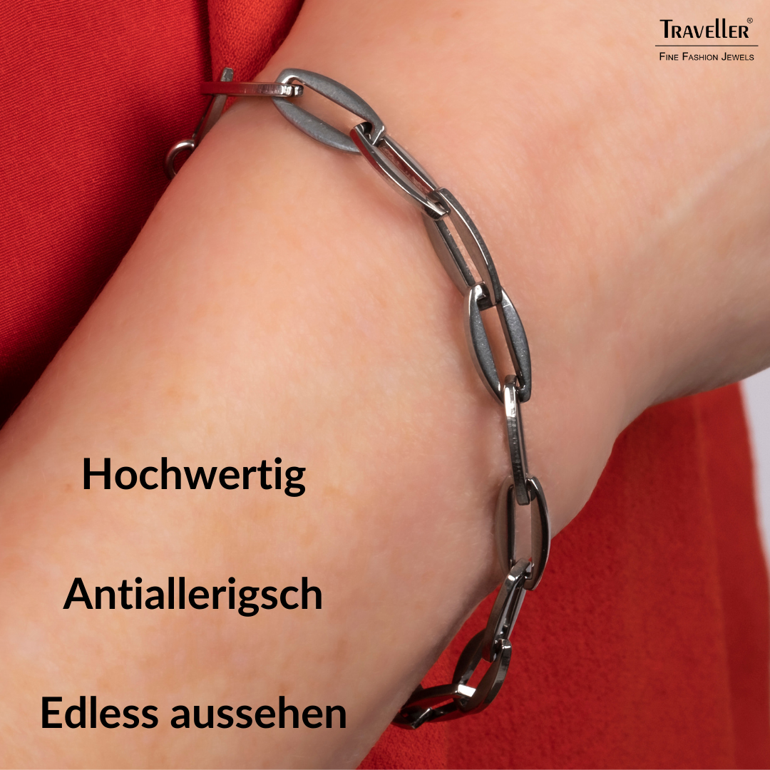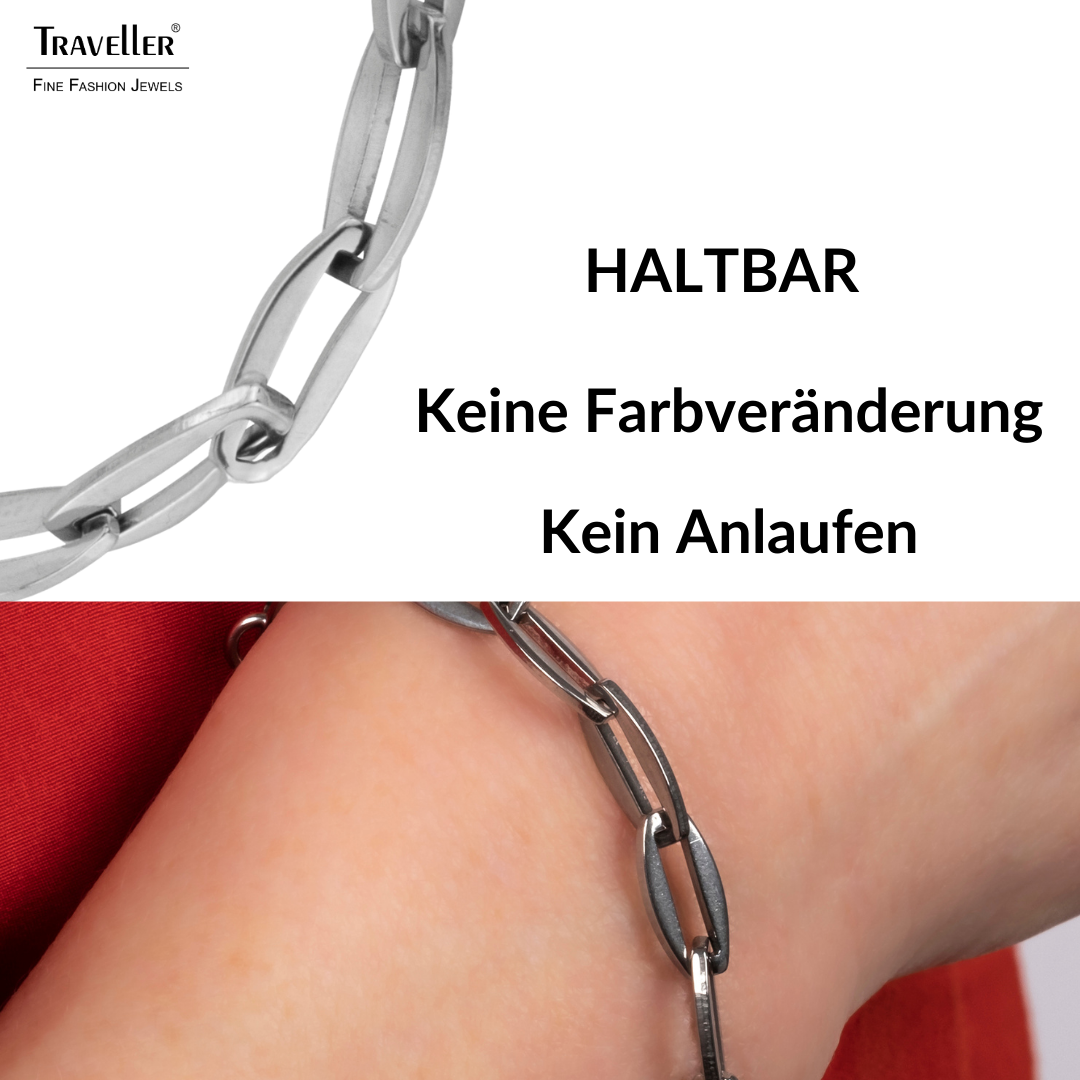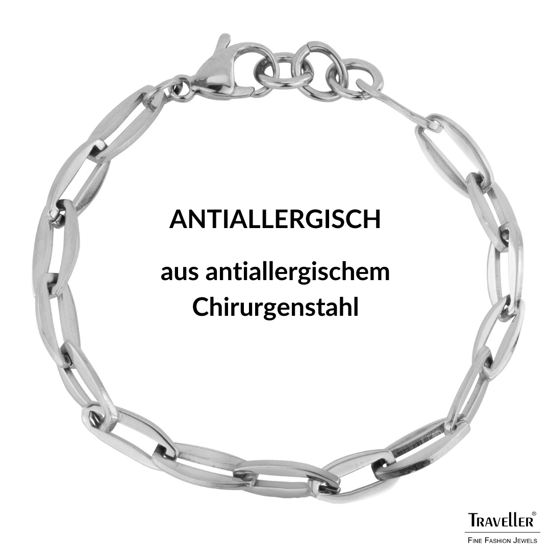 Das schlichte Design und die größere Größe machen dieses stilvolle Armband zu einem Blickfang, der zu jedem Outfit passt. Das Edelstahlarmband von Traveller besteht aus abgeflachten Gliedern. Das Armband ist 20 Zentimeter lang und wiegt 10 Gramm. Ergänzen Sie es mit der passenden Collier!