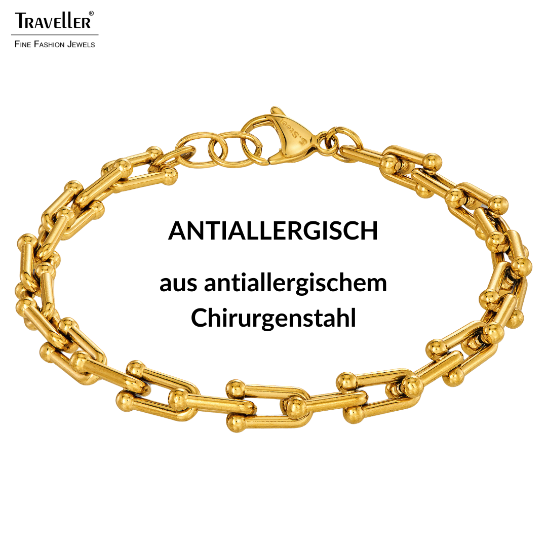 Kraftvoll, einzigartig, modern. Dieses Armband von Traveller besteht aus ungewöhnlichen Gliedern. Die goldfarbene Edelstahlarmband ist 21 Zentimeter lang, die Glieder sind 7 Millimeter breit. Ergänzen Sie es mit der passenden Halskette (181270).