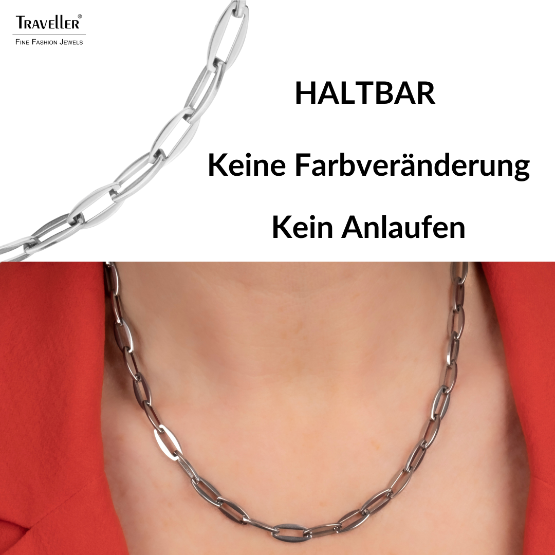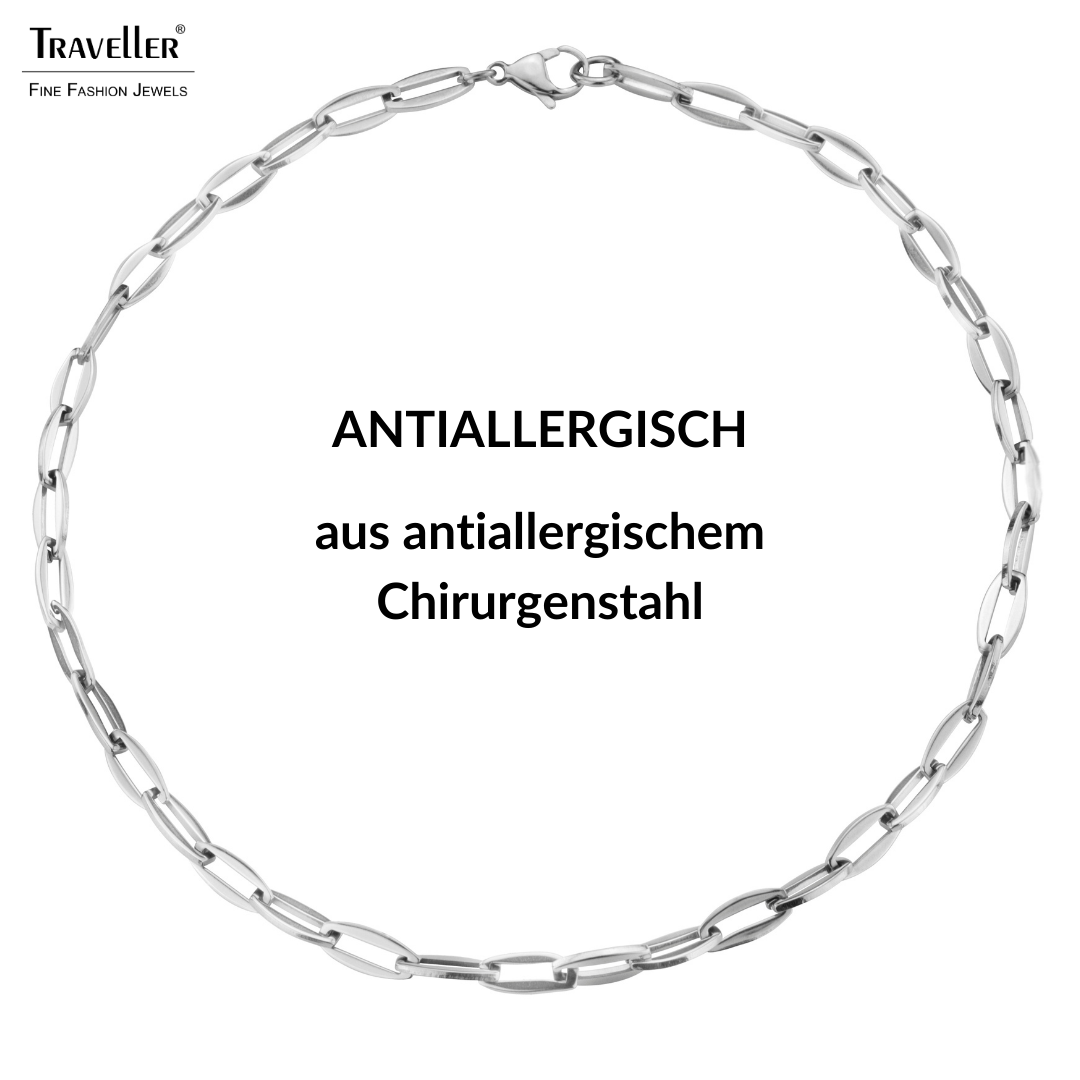 Das schlichte Design und die größere Größe machen diese stilvolle Halskette zu einem Blickfang, der zu jedem Outfit passt. Die Edelstahl-Halskette von Traveller besteht aus abgeflachten Gliedern. Die Kette ist 45 Zentimeter lang und wiegt 20 Gramm. Diese Halskette wird in einer umweltzertifizierten Geschenkbox geliefert.