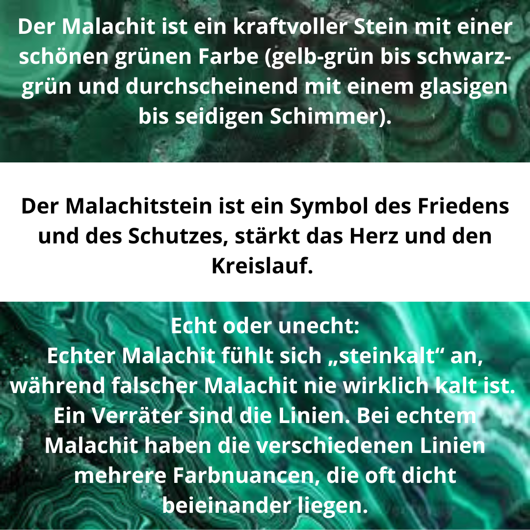 Malachit ist ein kraftvoller Arbeitsstein. Es handelt sich um ein Mineral, ein Kupferkarbonat, mit einer schönen grünen Farbe, das als Schmuckstein verwendet wird. Die Oxidation von Kupfervorkommen verleiht dem Malachit diese typische Farbe. Der Malachitstein ist ein Symbol des Friedens und des Schutzes, er stärkt das Herz und den Kreislauf und zeichnet sich durch eine sehr bunte grüne Farbe aus.