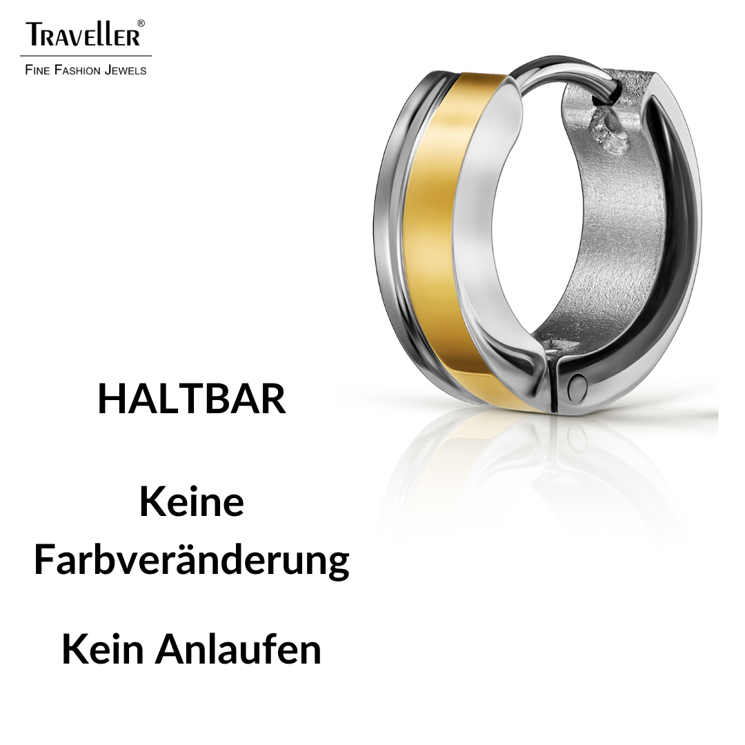 Ein schickes, zeitloses Paar Ohrringe von Traveller. Die Ohrringe sind komplett aus Edelstahl gefertigt und haben auf der Hauptseite ein vergoldetes (goldfarbenes) Band. Die Ohrringe haben einen Durchmesser von 13 Millimetern und sind 4 Millimeter breit. Pro Stück wiegen die Ohrringe nur 2 Gramm.
