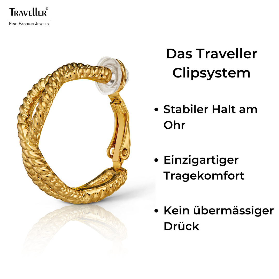 Diese Ohrringe von Traveller haben ein besonderes Design. Die vergoldeten Ohrclips sind wie ein Ohrring geformt. Goldfarbene Stränge sind in einem durchbrochenen Muster geflochten. Die Clip Ohrringe haben einen Durchmesser von 24 Millimetern, sind 8 Millimeter breit und wiegen jeweils 3,5 Gramm. Dank des einzigartigen Verschlusssystems von Traveller sind diese Ohrclips sehr bequem, leicht und sicher zu tragen.