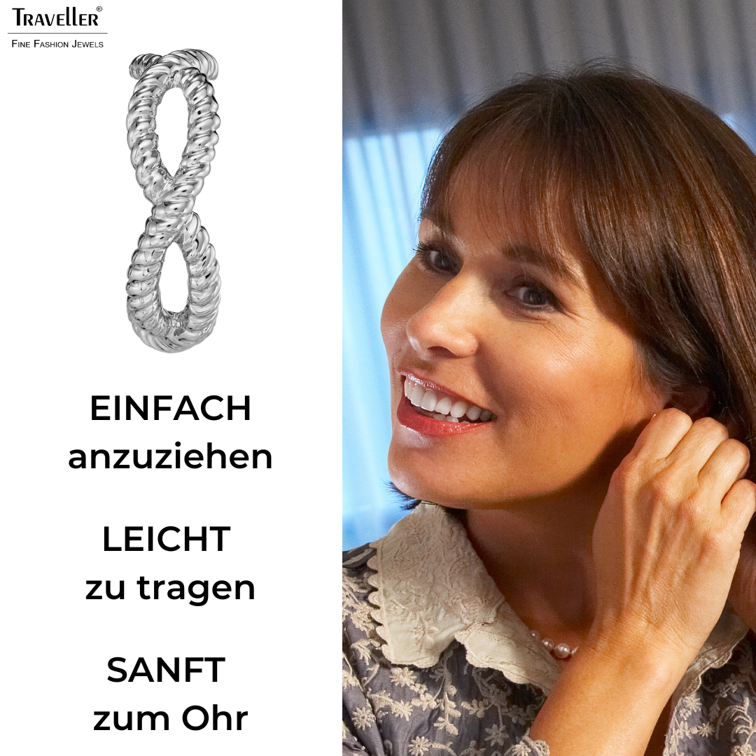 Diese Ohrringe von Traveller haben ein besonderes Design. Die platinierten Ohrclips sind wie ein Ohrring geformt. Silberfarbene Stränge sind in einem durchbrochenen Muster geflochten. Die Clip Ohrringe haben einen Durchmesser von 24 Millimetern, sind 8 Millimeter breit und wiegen jeweils 3,5 Gramm. Dank des einzigartigen Verschlusssystems von Traveller sind diese Ohrclips sehr bequem, leicht und sicher zu tragen.