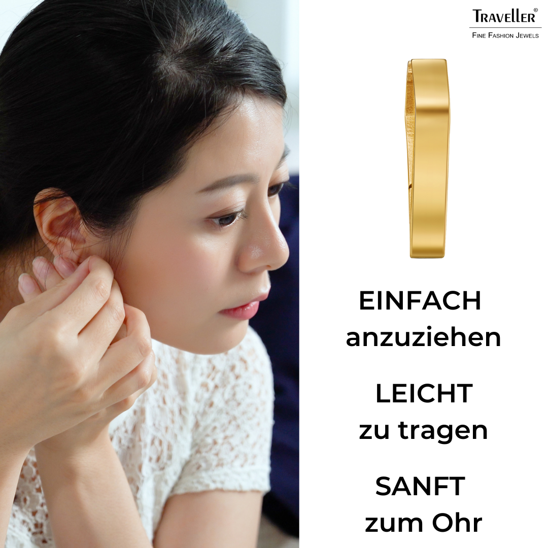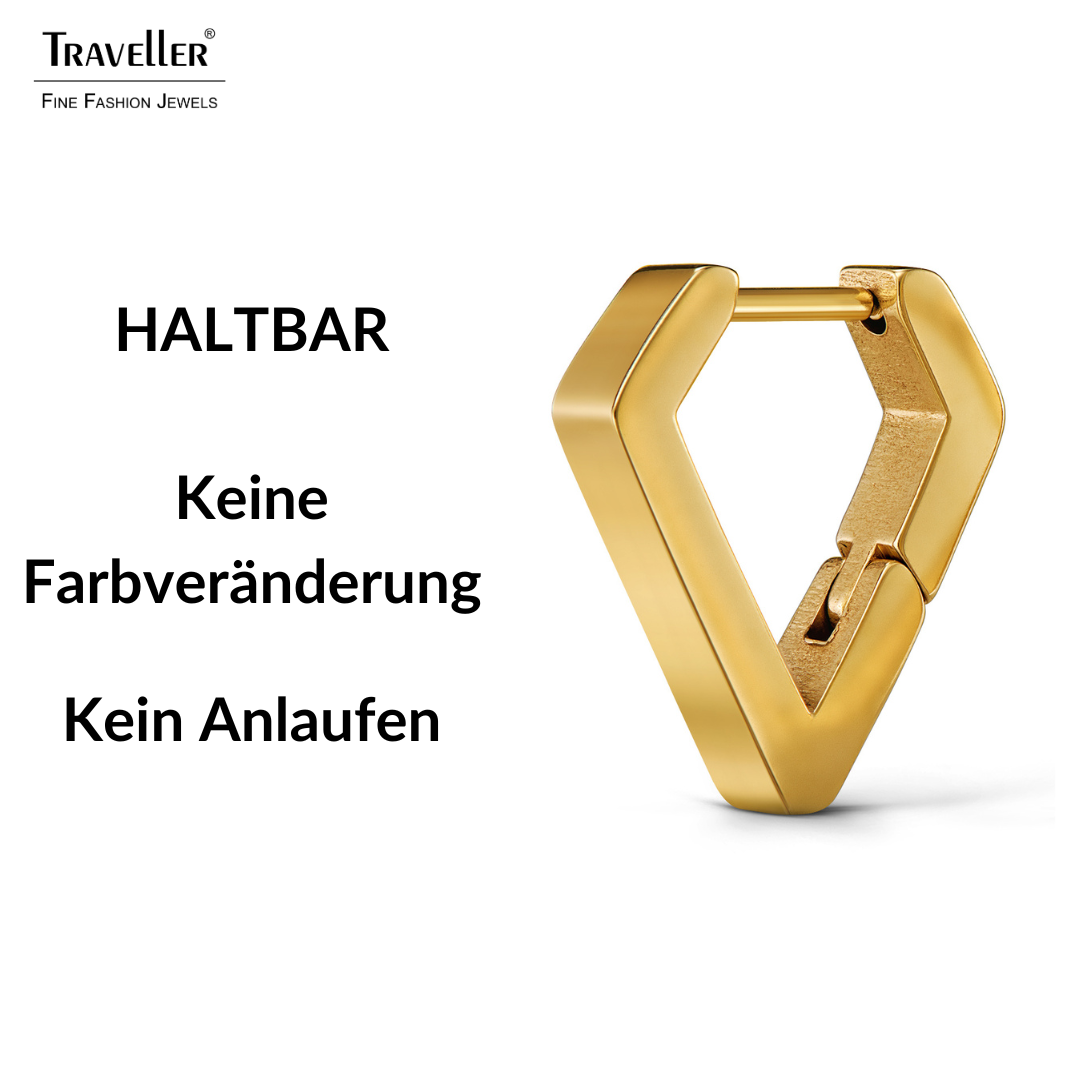 Diese ungewöhnlichen Ohrringe von Traveller verleihen dem Dreieck eine ganz besondere Note, die Form erinnert an einen eindimensionalen Diamanten. Die goldfarbenen Ohrstecker sind aus Edelstahl gefertigt und vergoldet. Die Ohrringe sind 16 x 3 Millimeter groß und wiegen nur 1,5 Gramm pro Ohrring. Das Scharniersystem sorgt zudem für einen stabilen und angenehmen Tragekomfort der Ohrringe.