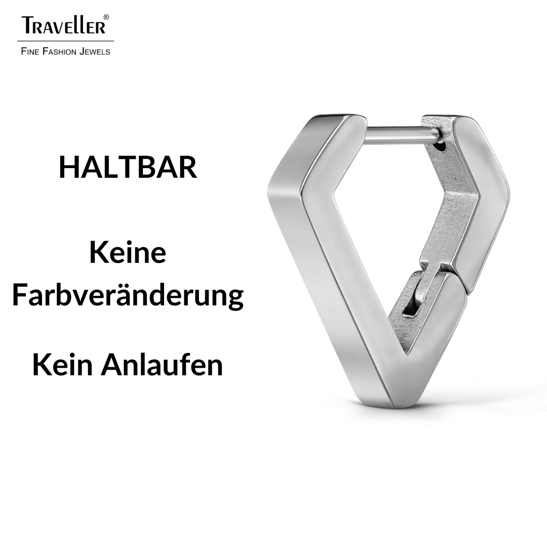 Diese ungewöhnlichen Ohrringe von Traveller verleihen dem Dreieck eine ganz besondere Note, die Form erinnert an einen eindimensionalen Diamanten. Die silberfarbenen Ohrstecker sind aus Edelstahl gefertigt. Die Ohrringe sind 16 x 3 Millimeter groß und wiegen nur 1,5 Gramm pro Ohrring. Das Scharniersystem sorgt zudem für einen stabilen und angenehmen Tragekomfort der Ohrringe.