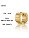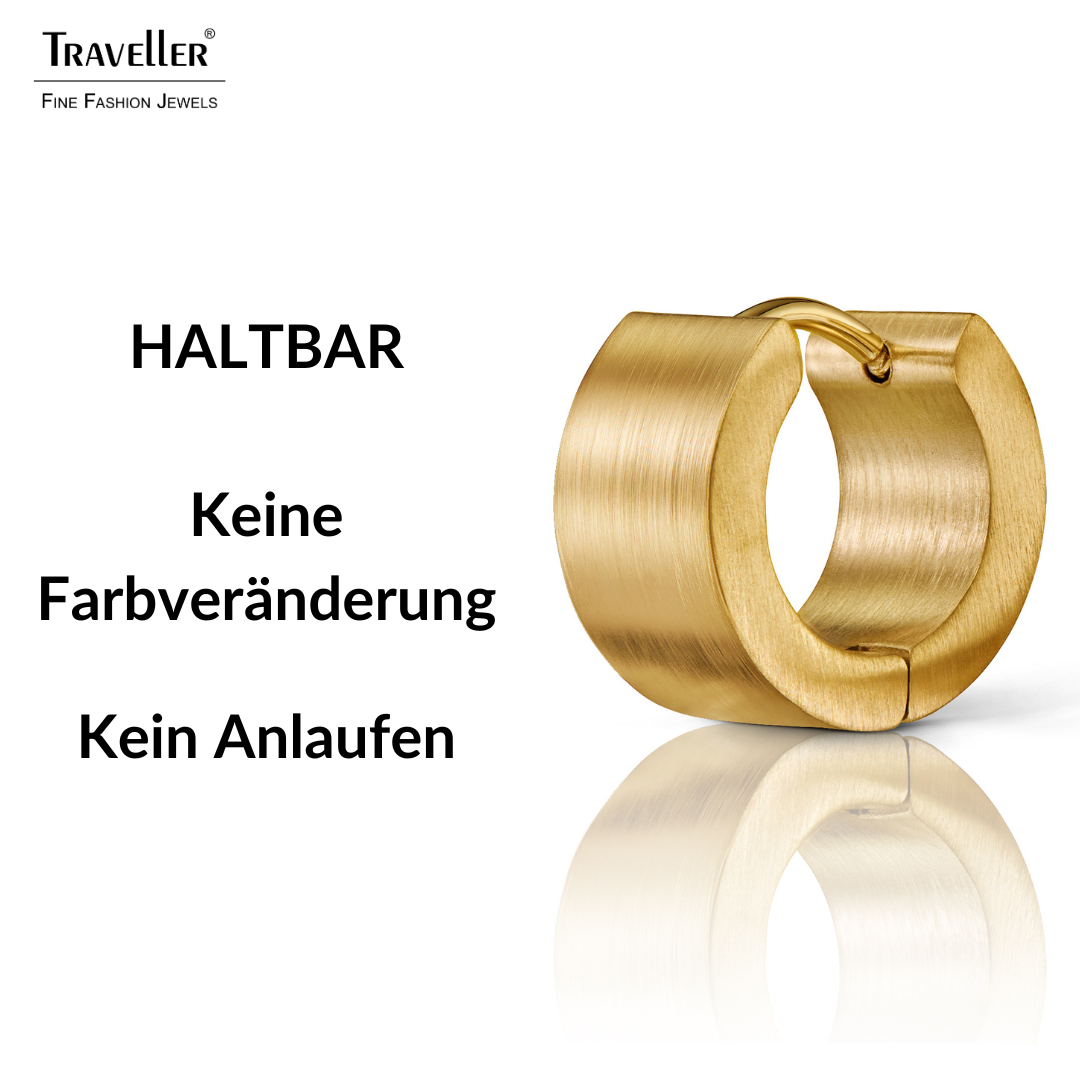 Diese robusten und stilvollen Ohrringe von Traveller sind ein Blickfang, aber nicht zu aufdringlich. Die mattierten goldfarbene Ohrringe sind aus vergoldetem Edelstahl gefertigt. Die Ohrringe haben einen Durchmesser von 14 Millimetern, sind 7 Millimeter breit und wiegen 3,5 Gramm pro Ohrring. Das Scharniersystem sorgt zudem für einen stabilen und angenehmen Tragekomfort der Ohrringe.