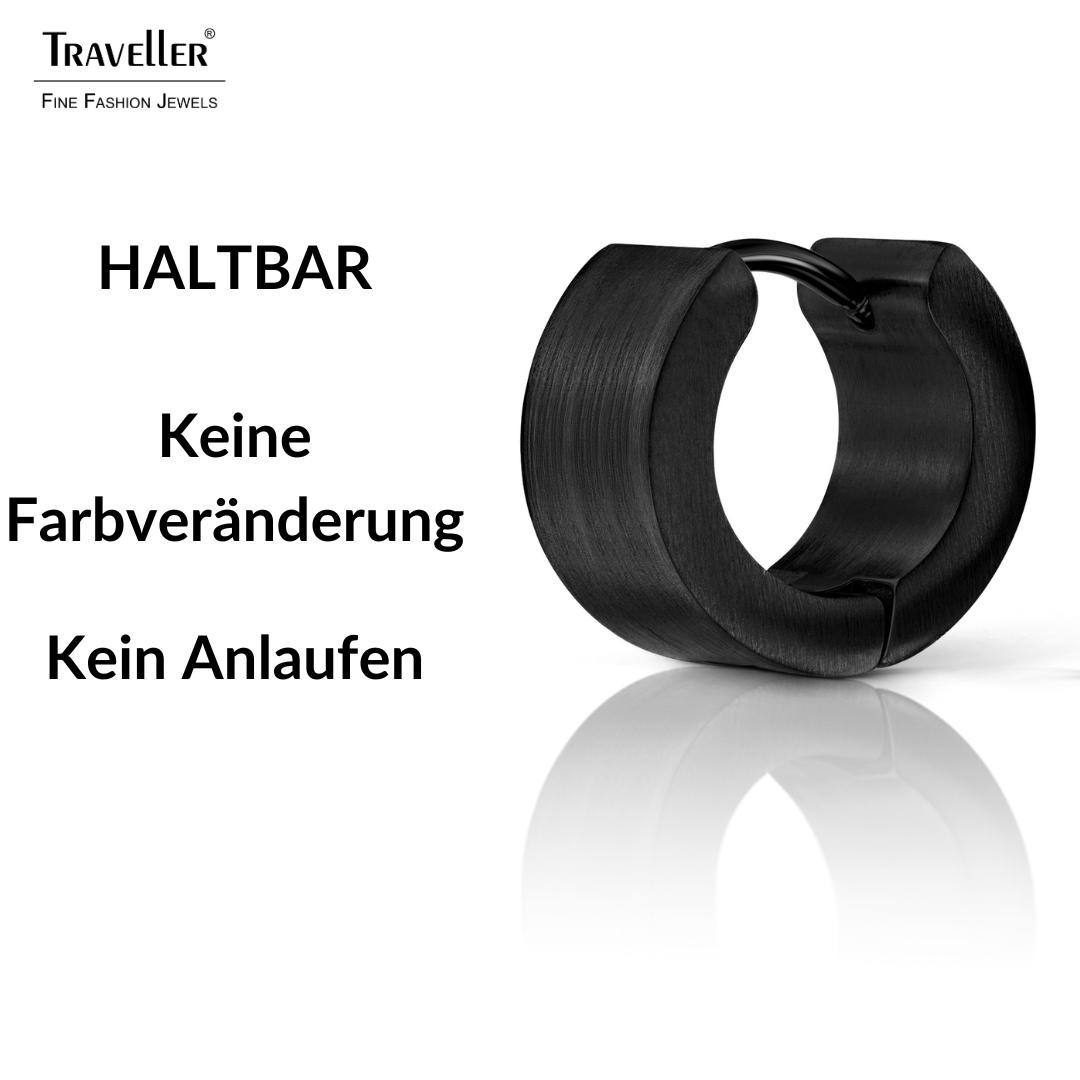 Diese Ohrringe von Traveller sind robust und stilvoll. Die mattierten schwarzen ohrringe sind aus Edelstahl gefertigt. Die Ohrringe haben einen Durchmesser von 14 Millimetern, sind 7 Millimeter breit und wiegen nur 3,5 Gramm pro Ohrring. Das Scharniersystem sorgt zudem für einen stabilen und angenehmen Tragekomfort der Ohrringe.