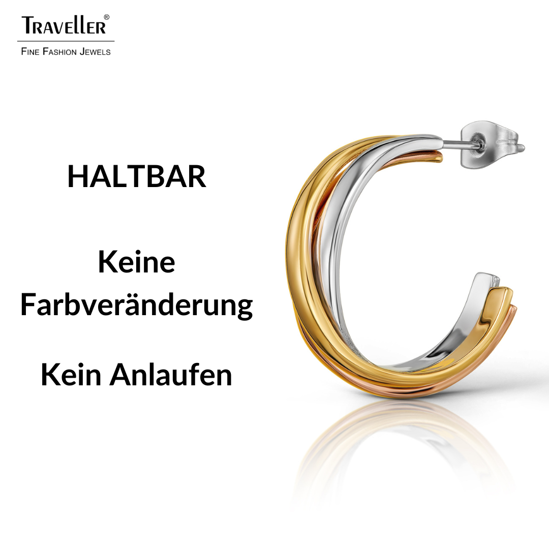 Diese besonderen Ohrringe von Traveller werden Sie zum Strahlen bringen. Die Ohrringe sind elegant und in schönen Farben gehalten. Die Ohrringe sind aus Edelstahl gefertigt und bestehen aus drei ineinander verschlungenen Ringen. Die Ringe haben drei Farben oder sind tricolor. Ein goldener Ring, der aus vergoldetem Edelstahl besteht, ein silberner Ring, der aus reinem Edelstahl besteht und ein rosafarbener Ring, der aus Roségold beschichtetem Edelstahl gefertigt ist. Die Ohrringe haben einen Durchmesser von 25 Millimetern, sind 7 Millimeter breit und wiegen 5 Gramm pro Ohrring.