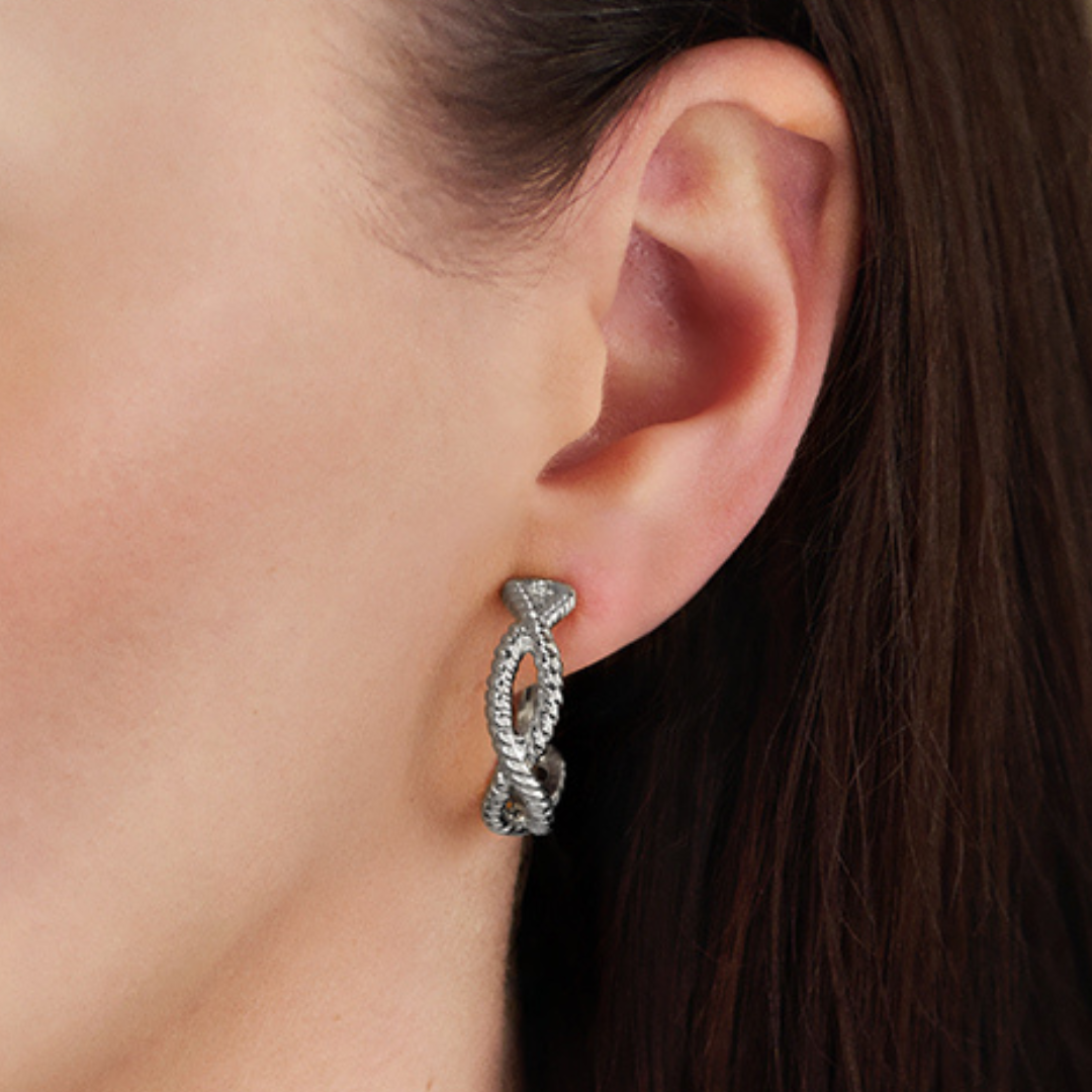 Diese Ohrringe von Traveller haben ein besonderes Design. Die platinierten Ohrclips sind wie ein Ohrring geformt. Silberfarbene Stränge sind in einem durchbrochenen Muster geflochten. Die Clip Ohrringe haben einen Durchmesser von 24 Millimetern, sind 8 Millimeter breit und wiegen jeweils 3,5 Gramm. Dank des einzigartigen Verschlusssystems von Traveller sind diese Ohrclips sehr bequem, leicht und sicher zu tragen.