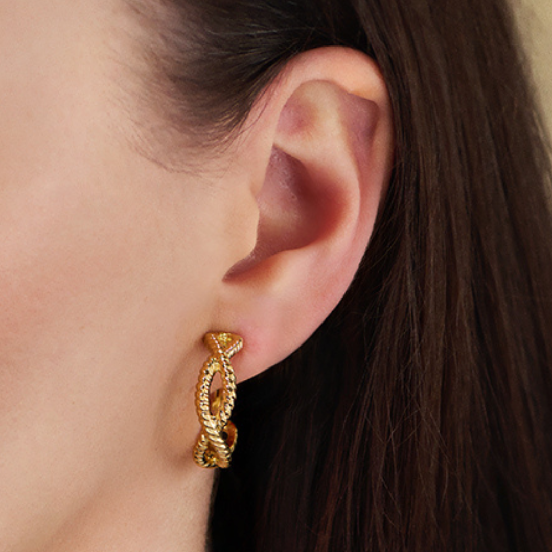 Diese Ohrringe von Traveller haben ein besonderes Design. Die vergoldeten Ohrclips sind wie ein Ohrring geformt. Goldfarbene Stränge sind in einem durchbrochenen Muster geflochten. Die Clip Ohrringe haben einen Durchmesser von 24 Millimetern, sind 8 Millimeter breit und wiegen jeweils 3,5 Gramm. Dank des einzigartigen Verschlusssystems von Traveller sind diese Ohrclips sehr bequem, leicht und sicher zu tragen.