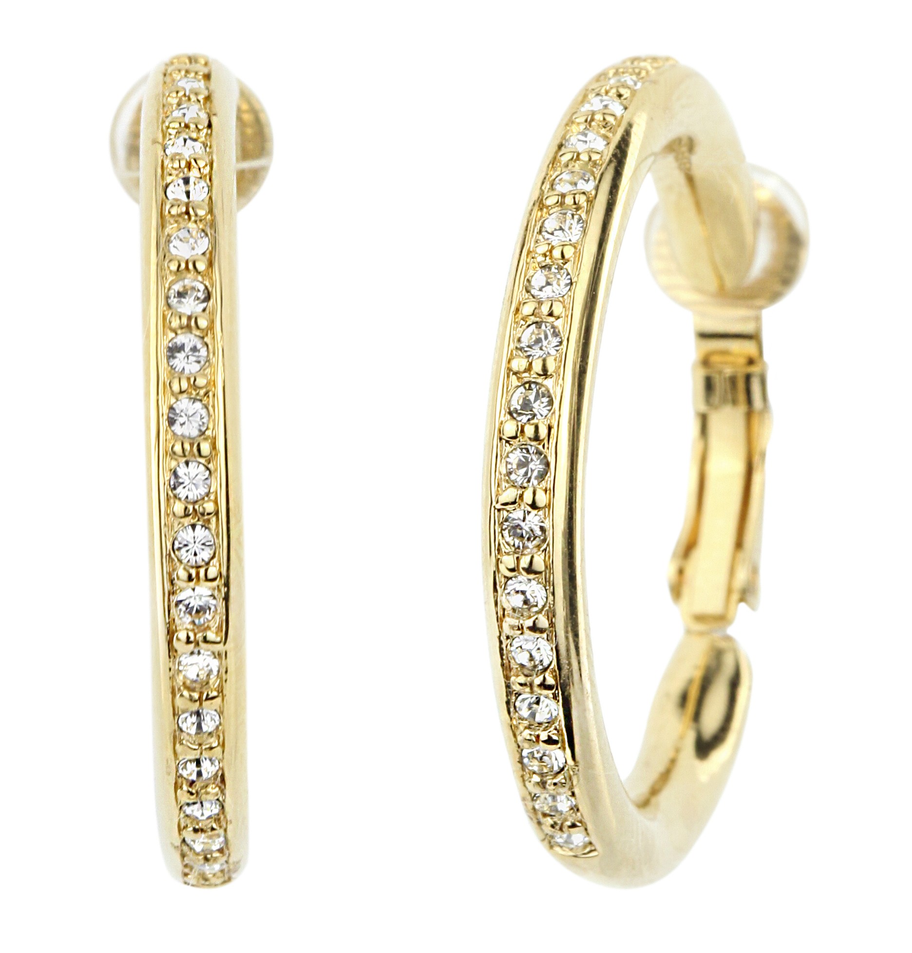 Ohrringe sind seit Jahren eine Ikone in der Modewelt; diese von Traveller sind speziell für diejenigen ohne Löcher konzipiert. Die funkelnden Clips sind vollständig mit 22-karätigem Gold beschichtet (Kernmaterial: Metall) und mit Preciosa-Kristallen besetzt. Die Ohrringe haben einen Durchmesser von 33 Millimetern, eine Dicke von 4 Millimetern und wiegen jeweils 6 Gramm. Dank des einzigartigen Verschlusssystems von Traveller sind diese Ohrringe bequem, leicht und sicher zu tragen.