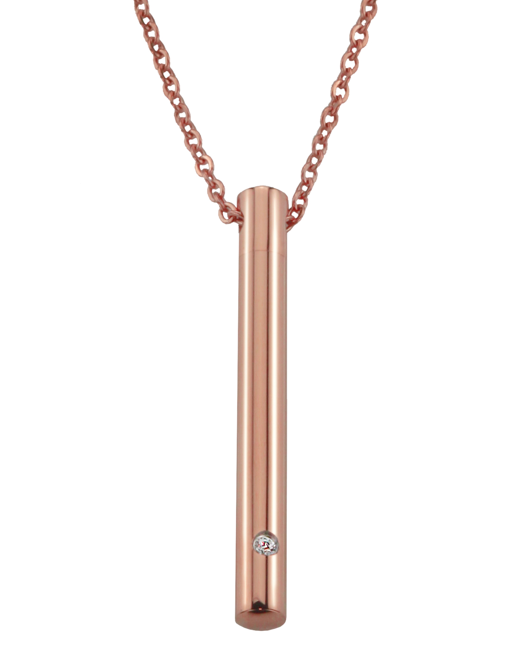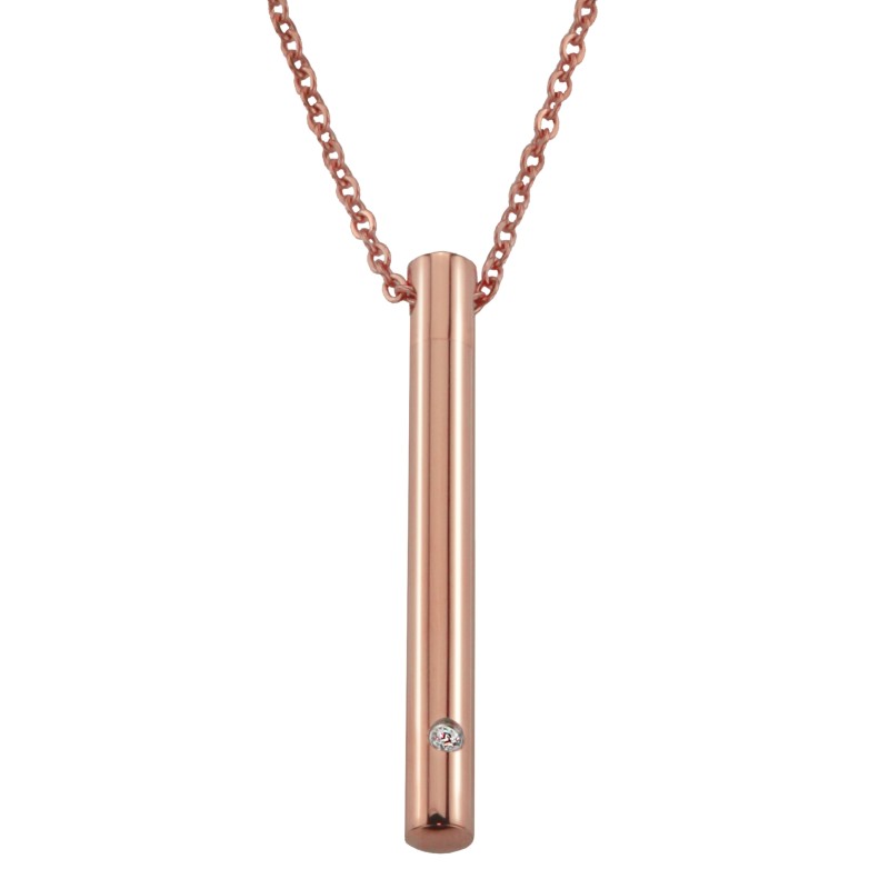 Mit dieser Halskette von Traveller können Sie Ihre Liebsten immer bei sich tragen. An der Kette hängt ein Rohr zur Aufbewahrung der Asche. Dieser Aschebehälter ist unten mit Zirkonium verziert. Kette und Anhänger bestehen aus rosé vergoldeten Edelstahl. Der Anhänger hat eine Länge von 45 Millimetern, die Kette ist längenverstellbar von 45 bis 50 Zentimeter.