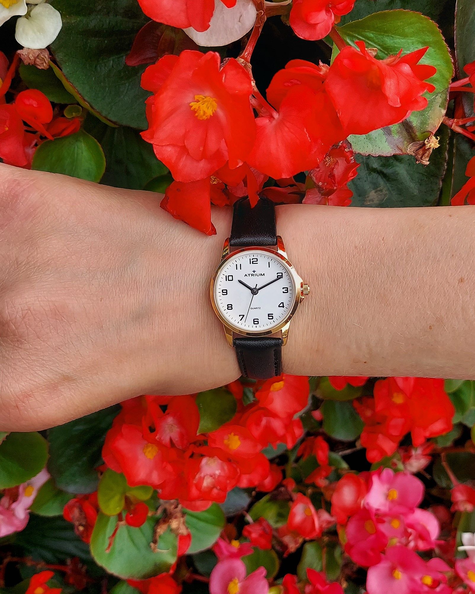 Eine klassische, zeitlose und vor allem klare Uhr von ATRIUM. Die Uhr hat ein klares Zifferblatt mit einer Mineralglasplatte. Umgeben davon ist ein goldfarbenes Uhrengehäuse aus Metall, das die Krone schützt. Darüber hinaus verfügt es über ein Lederarmband. Die Uhr ist 3 bar wasserdicht, das heißt, sie ist gegen kleine Wassermengen, wie zum Beispiel Spritzer beim Händewaschen, geschützt.