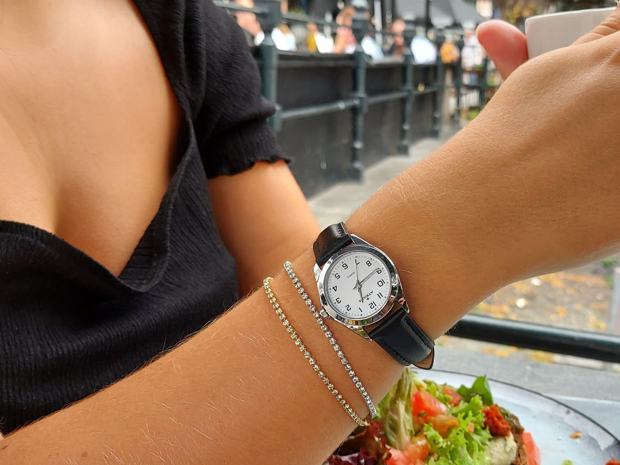 Eine klassische, zeitlose und vor allem klare Uhr von ATRIUM. Die Uhr hat ein klares Zifferblatt mit einer Mineralglasplatte. Umgeben davon ist ein silberfarbenes Uhrengehäuse aus Metall, das die Krone schützt. Darüber hinaus verfügt es über ein Lederarmband. Die Uhr ist 3 bar wasserdicht, das heißt, sie ist gegen kleine Wassermengen, wie zum Beispiel Spritzer beim Händewaschen, geschützt.
