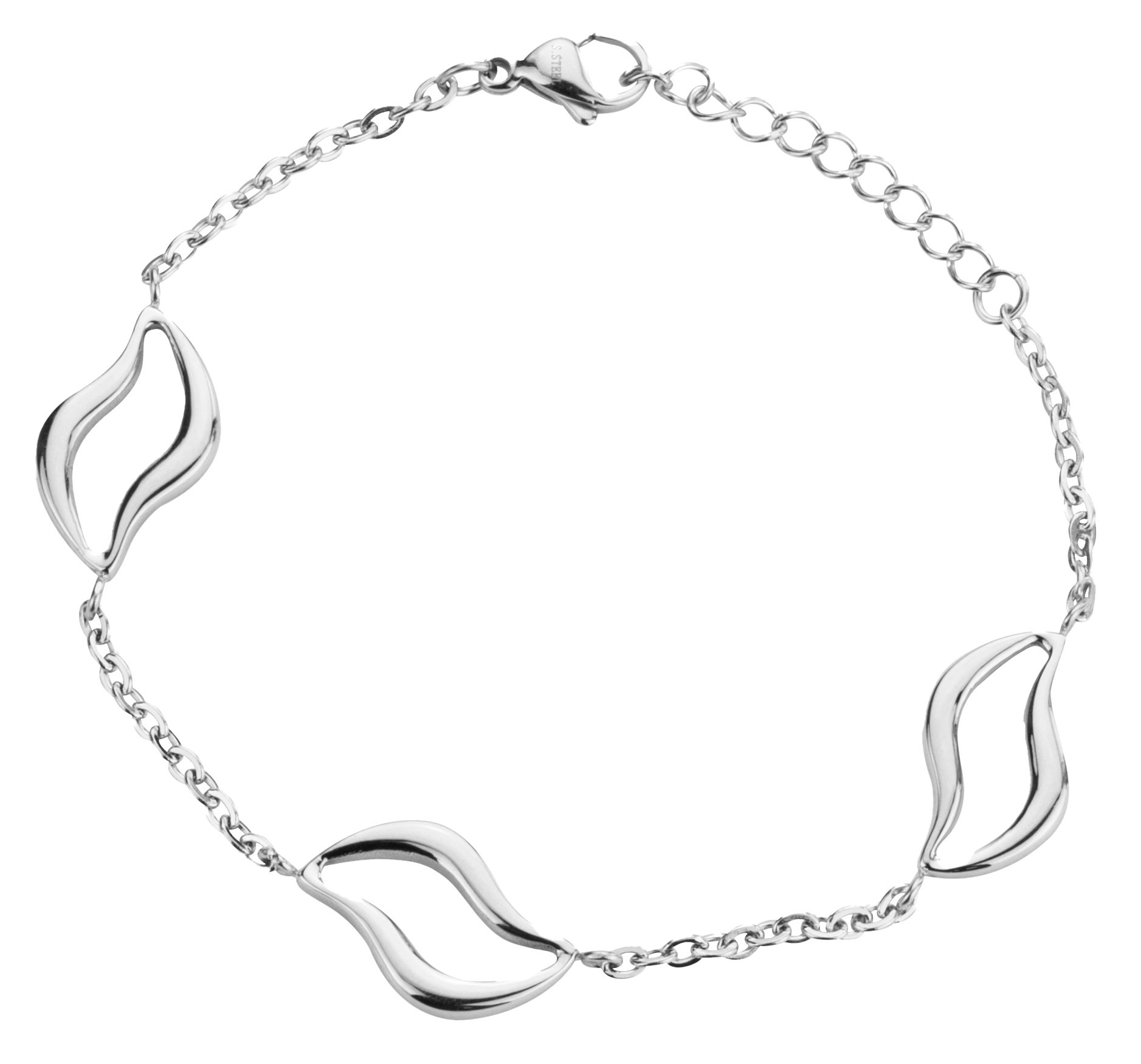 Dieses Armband von Travller hat ein einzigartiges, künstlerisches Design. An dem Armband hängen mehrere Anhänger in einer abstrakten, wellenförmigen Form. Das Edelstahlarmband hat eine Länge von 17 Zentimetern und kann auf 20 Zentimeter verlängert werden. Das Gewicht des Armbands beträgt 5 Gramm.