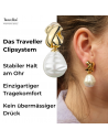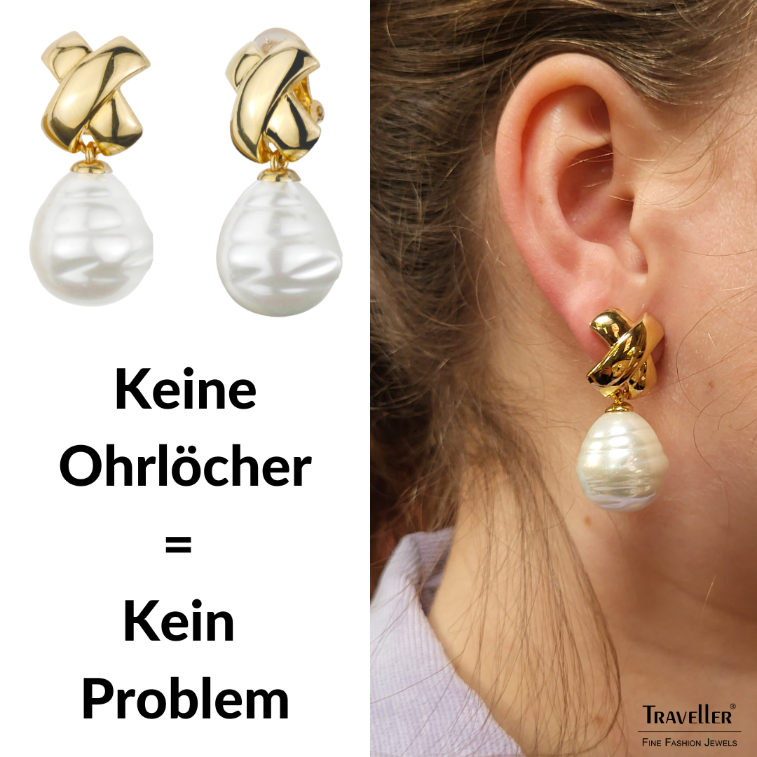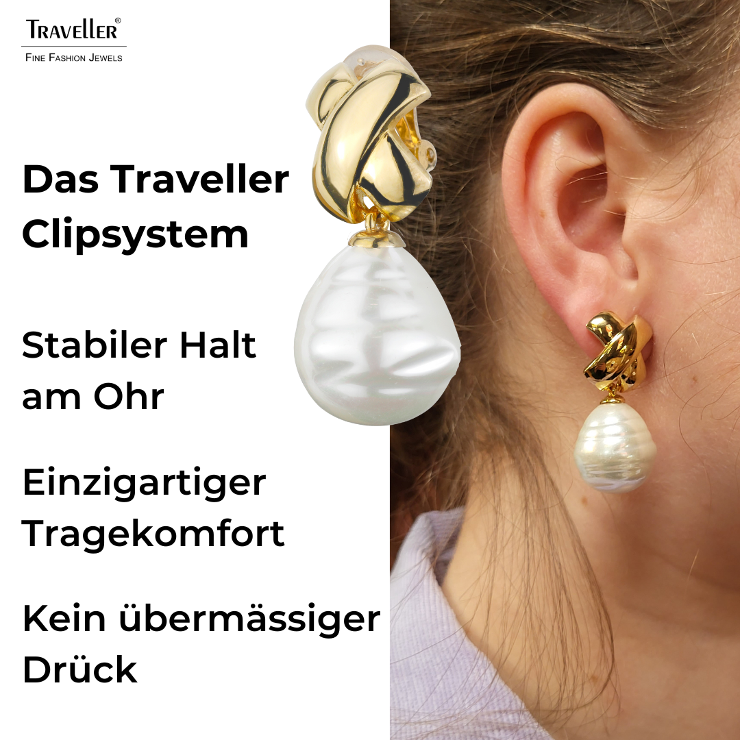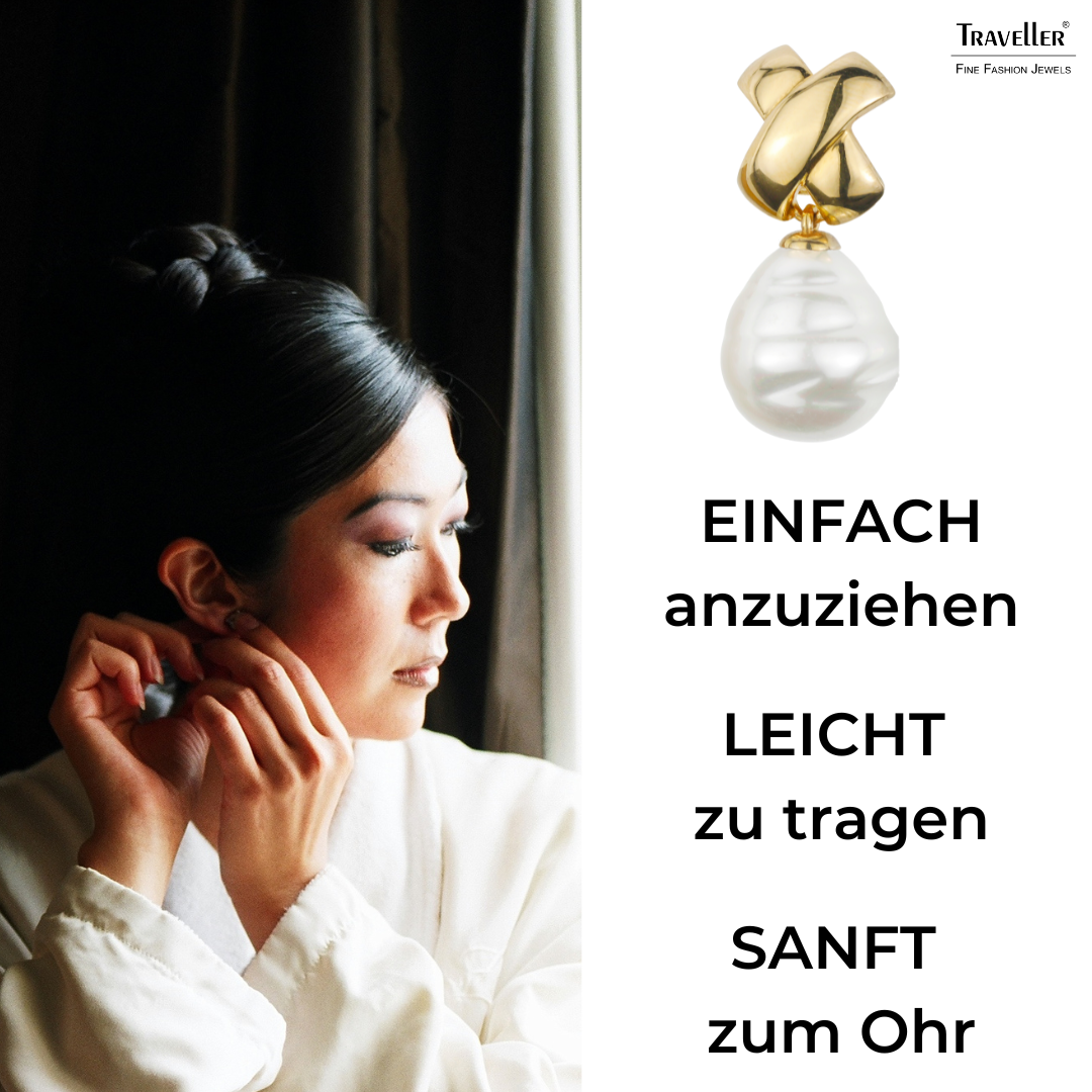 Diese schicken Ohrringe von Traveller mit Barockperlen sind majestätisch. Die 22 Karat vergoldeten Ohrclips (Kernmaterial: Metall) bestehen aus einem goldfarbenen Kreuz, an dem eine weiße Barockperle hängt. Die Form dieser Barockperlen wird bei jeder Perle von Hand geformt. Die hochwertigen Perlenimitate stammen aus Mallorca - einer Insel, die für ihre Perlen bekannt ist. Die Ohrringe sind etwa 40 x 15 Millimeter groß und wiegen jeweils 12,5 Gramm. Dank des einzigartigen Clipverschlusses von Traveller sind sie sehr bequem, sicher und leicht zu tragen!