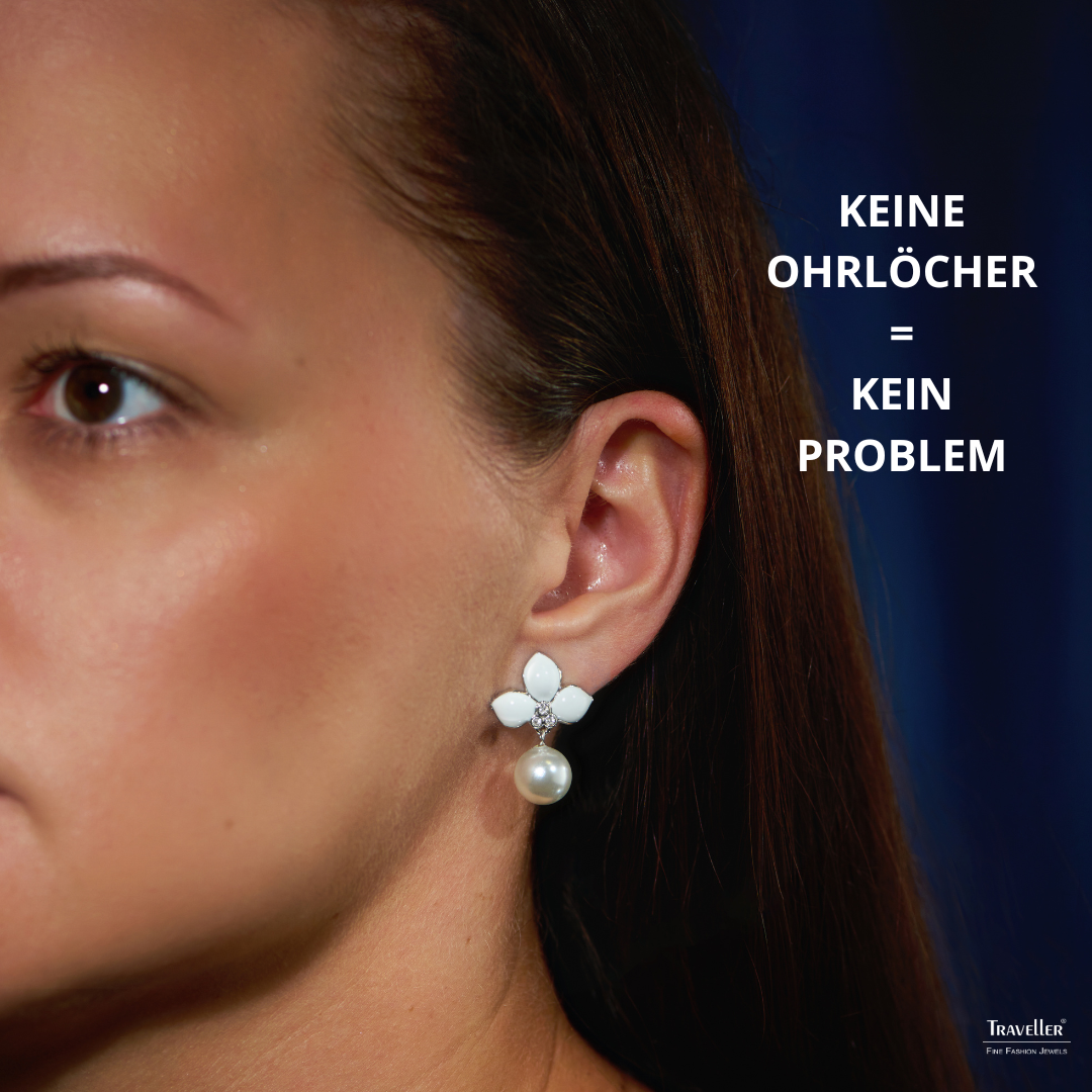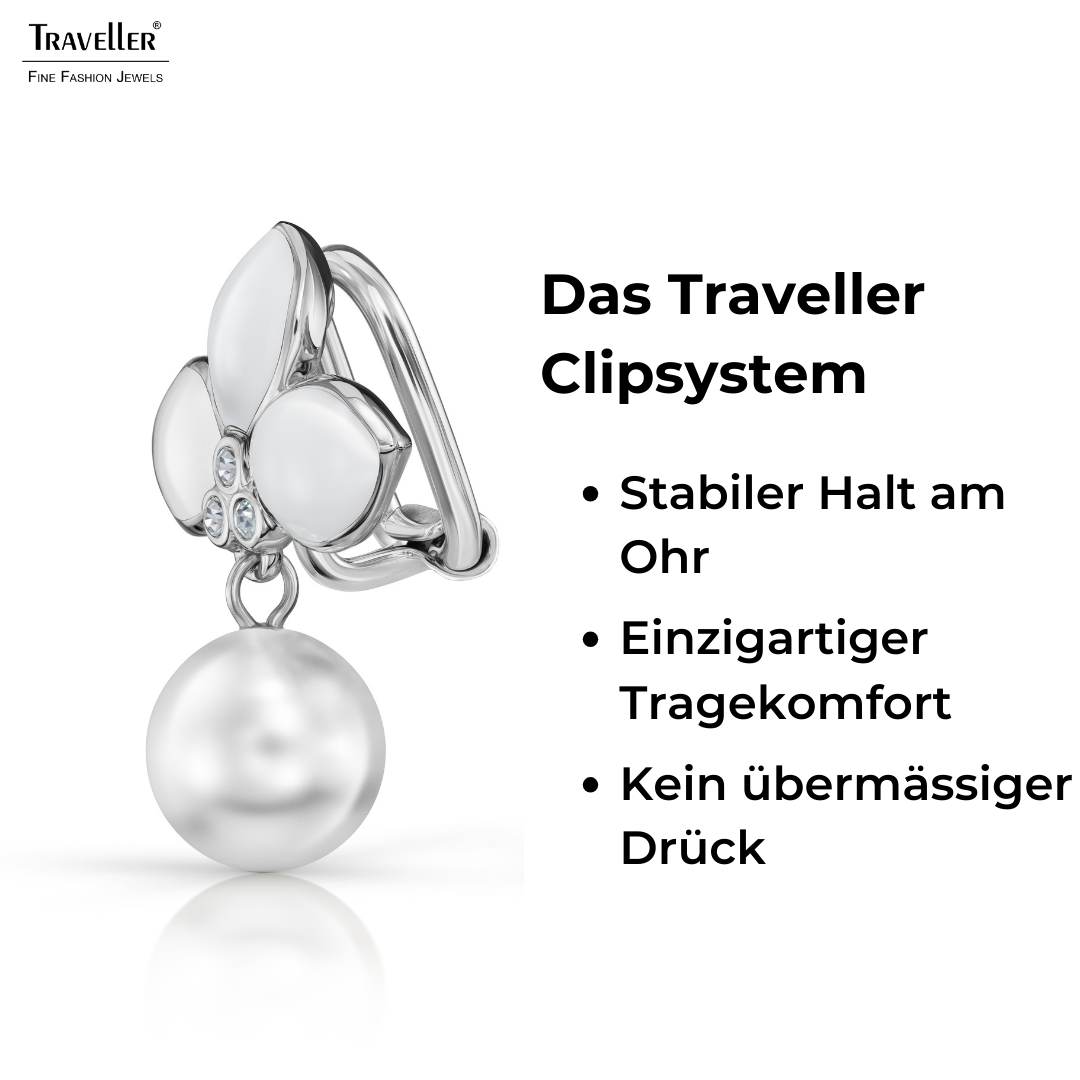 Diese schicken plattierten Ohrclips von Traveller bringen Sie zum Strahlen. In diesem Design hat der klassische weiße Perlenohrring oben 3 strahlend weiße Emailleblätter und darunter 3 funkelnde Kristalle von Preciosa. Die hochwertigen Perlenimitate stammen von der für ihre Perlen bekannten Insel Mallorca. Die plattierten Ohrringe sind 26 x 18 Millimeter groß und wiegen jeweils 4 Gramm. Dank des einzigartigen Verschlusssystems von Traveller sind diese Ohrclips sehr bequem, leicht und sicher zu tragen.