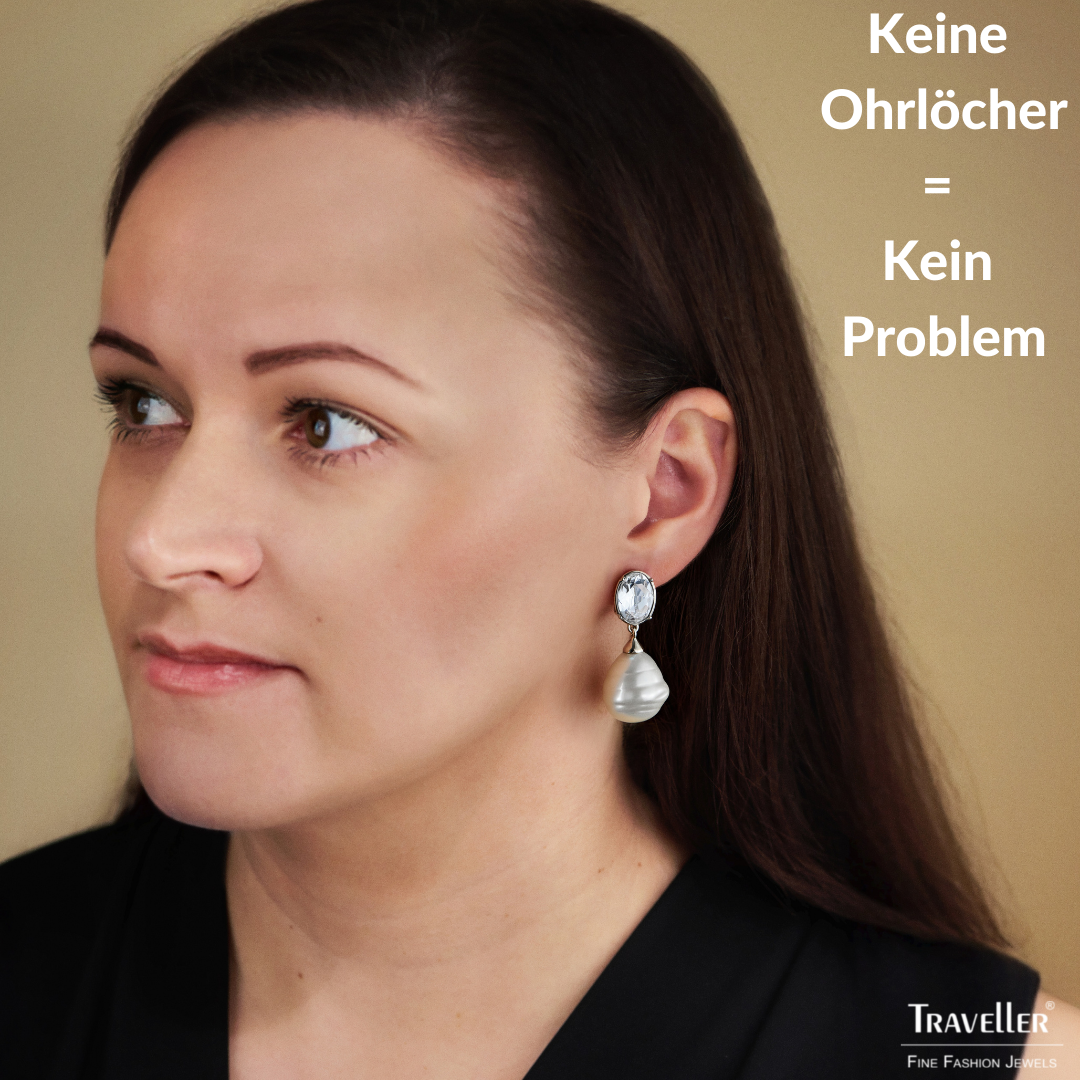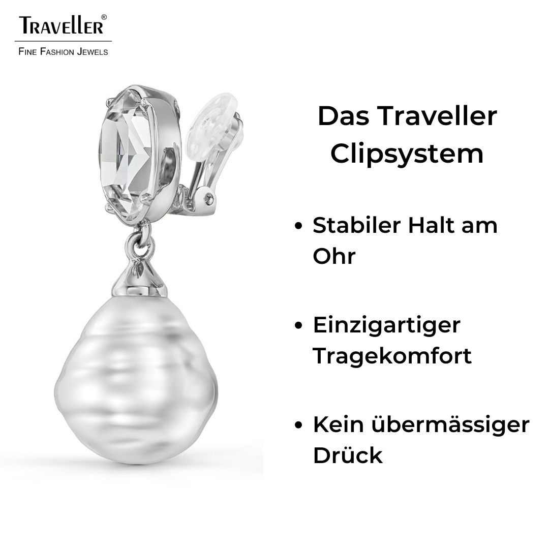 Pearls are a girls best friend und Kristalle auch! Diese schönen Ohrclips von Traveller haben beides: eine schöne große Barock Perle und einen atemberaubenden Kristall von Preciosa, der plattiert eingefasst ist. Platinierte Glieder verbinden die schöne Barockperle (20 x 17 Millimeter Groß) mit dem Kristall. Die Ohrringe haben eine Gesamtgröße von 42 x 17 Millimetern und wiegen 11,5 Gramm pro Ohrclip. Dank des einzigartigen Verschlusssystems von Traveller sind diese Ohrclips sehr bequem, leicht und sicher zu tragen.