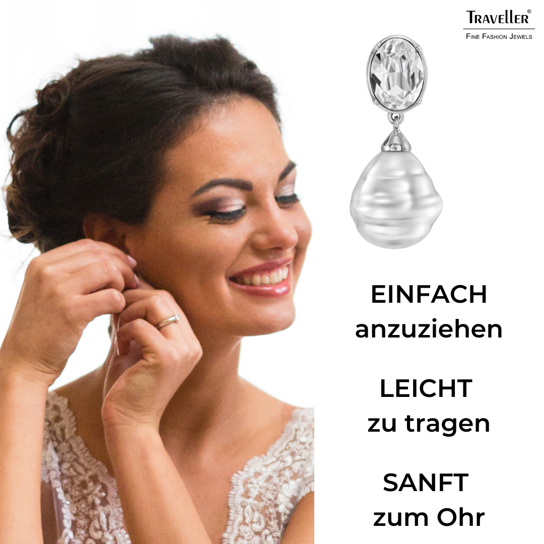 Traveller Ohrclips - Hänger - Silberfarbe - Barock Perle -20x17mm - Weiss - Kristalle - Platiniert - 42x17mm - 114285