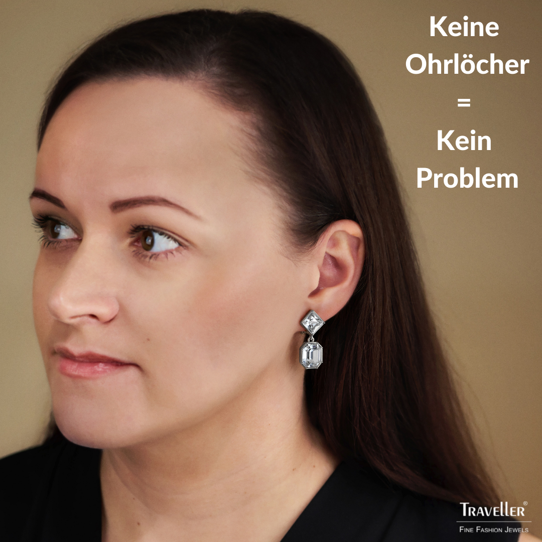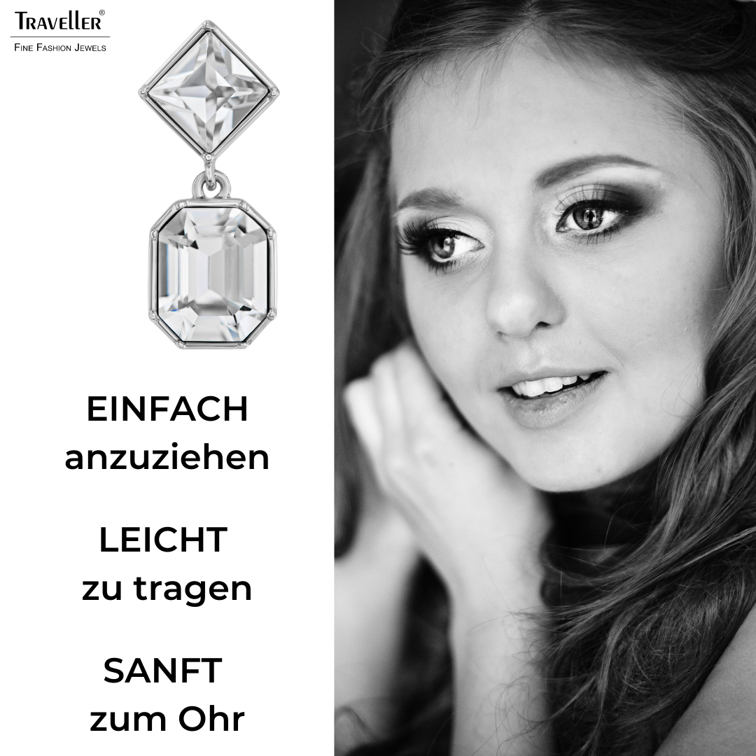 Mit diesen wunderschönen, funkelnden Ohrringen von Traveller werden Sie der strahlende Mittelpunkt sein! Die Ohrclips bestehen aus 2 glänzenden Preciosa-Kristallen, einem Quadrat und einem Achteck darunter, die von einem plattierten Rand umrahmt werden. Die Ohrringe sind 30 Millimeter lang, 13 Millimeter breit und wiegen 6 Gramm pro Ohrring. Dank des einzigartigen Verschlusssystems von Traveller sind diese Ohrclips sehr bequem, leicht und sicher zu tragen.