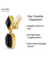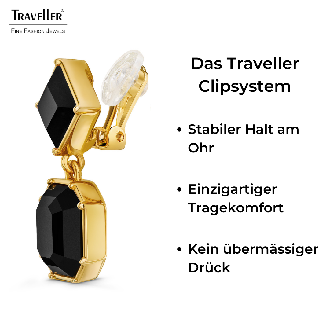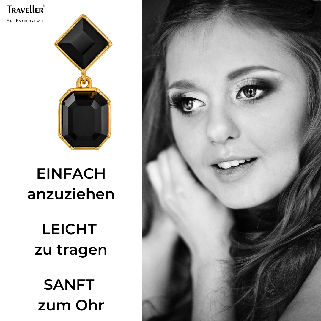 Mit diesen wunderschönen, funkelnden Ohrringen von Traveller stehlen Sie allen die Show! Die Ohrclips bestehen aus 2 schwarze schimmernden Kristallen von Preciosa, einem Quadrat mit einem Achteck darunter, das von einem 22-karätigen vergoldeten Rand eingerahmt wird. Die Ohrringe sind 30 Millimeter lang, 13 Millimeter breit und wiegen 6 Gramm pro Ohrring. Dank des einzigartigen Verschlusssystems von Traveller sind diese Ohrclips sehr bequem, leicht und sicher zu tragen.