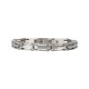 Dieses silberfarbene Traveller-Armband ist ein stilvolles, robustes, aber auch raffiniertes Accessoire. Das Armband ist aus Edelstahl gefertigt und erinnert an die Kette eines Fahrrads, kräftig, aber geschmeidig. Das Armband ist 21 Zentimeter lang, 0,8 Zentimeter breit und wiegt 35 Gramm.