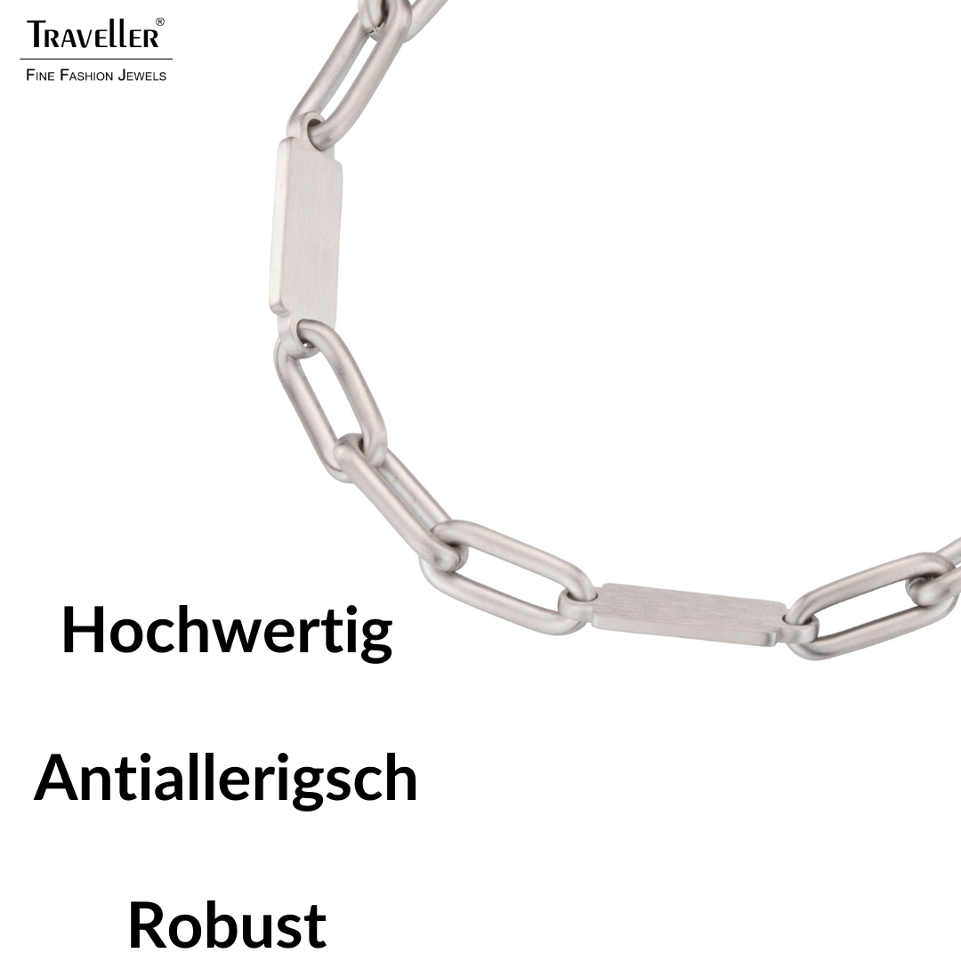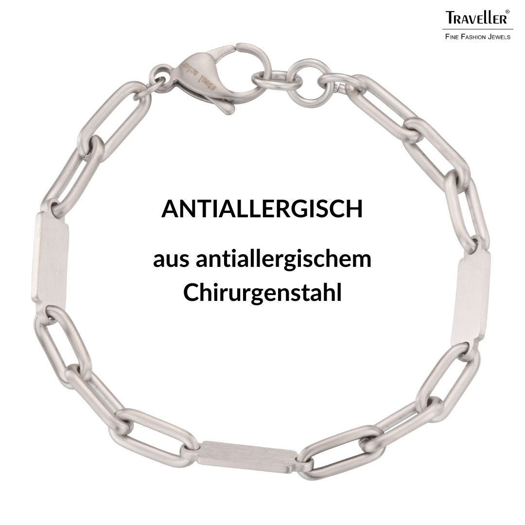 Diese matt silberfarbene Armband von Traveller ist ein stilvolles, cooles Accessoire. Das Armband ist aus Edelstahl gefertigt und is 22 Zentimer läng. Das Armband hat eine Breite von 6 Millimetern. Ergänzen Sie sie mit dem passenden Collier!