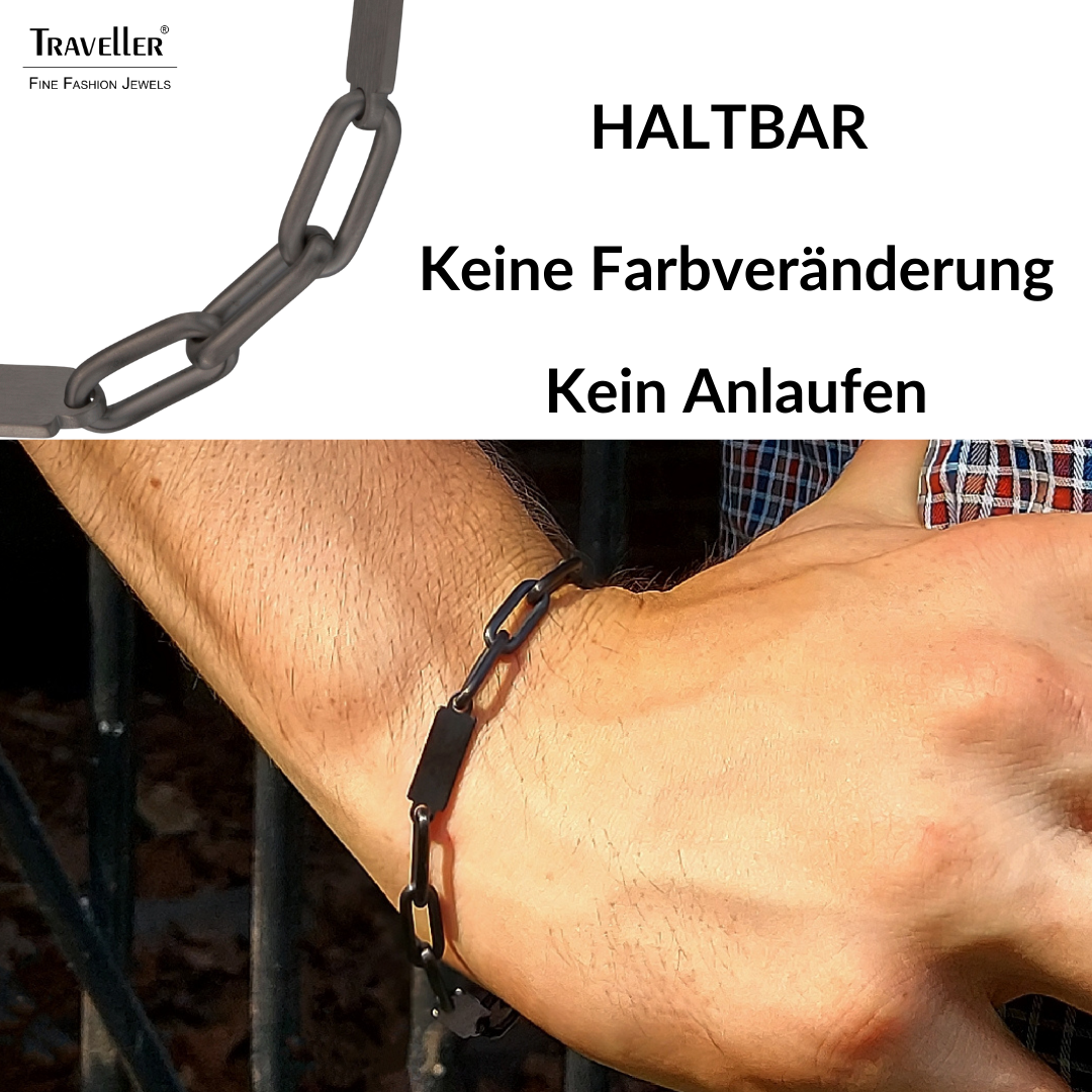 Diese matt schwarze Armband von Traveller ist ein stilvolles, cooles Accessoire. Das Armband ist aus Edelstahl gefertigt und 22 Zentimeter lang. Das Armband hat eine Breite von 6 Millimetern. Ergänzen Sie sie mit dem passenden Collier!
