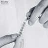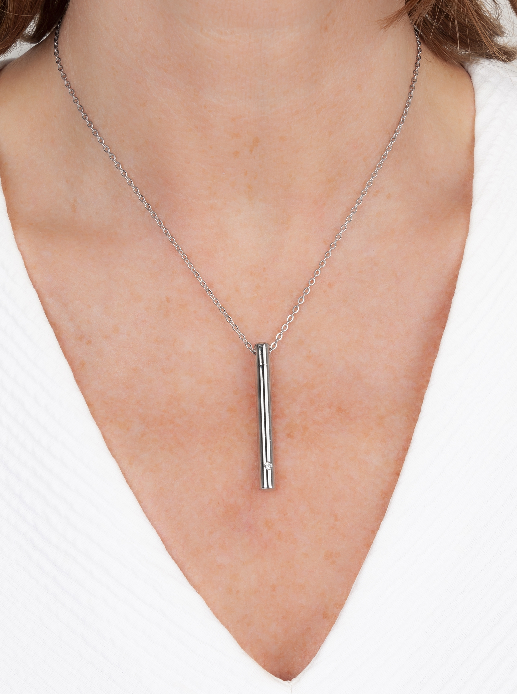 Mit dieser Halskette von Traveller können Sie Ihre Liebsten immer bei sich tragen. An der Kette hängt ein Rohr zur Aufbewahrung der Asche. Dieser Aschebehälter ist unten mit Zirkonium verziert. Kette und Anhänger bestehen aus silberfarbenem Edelstahl. Der Anhänger hat eine Länge von 45 Millimetern, die Kette ist längenverstellbar von 45 bis 50 Zentimeter.
