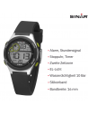 - "ÜBERSICHTLICHES DISPLAY mit deutlicher digitaler Anzeige von Uhrzeit, Datum und Wochentag (englisch) sowie 12 oder 24 Stundenanzeige; EL-Licht auf Knopfdruck FUNKTIONEN: Wecker, zweite Zeitzone (Dualzeit), abschaltbares Stundensignal, Stoppuhr (Chronograph) mit 1/100 Sekunde und Additionszeiten, Timer (Countdown)"
