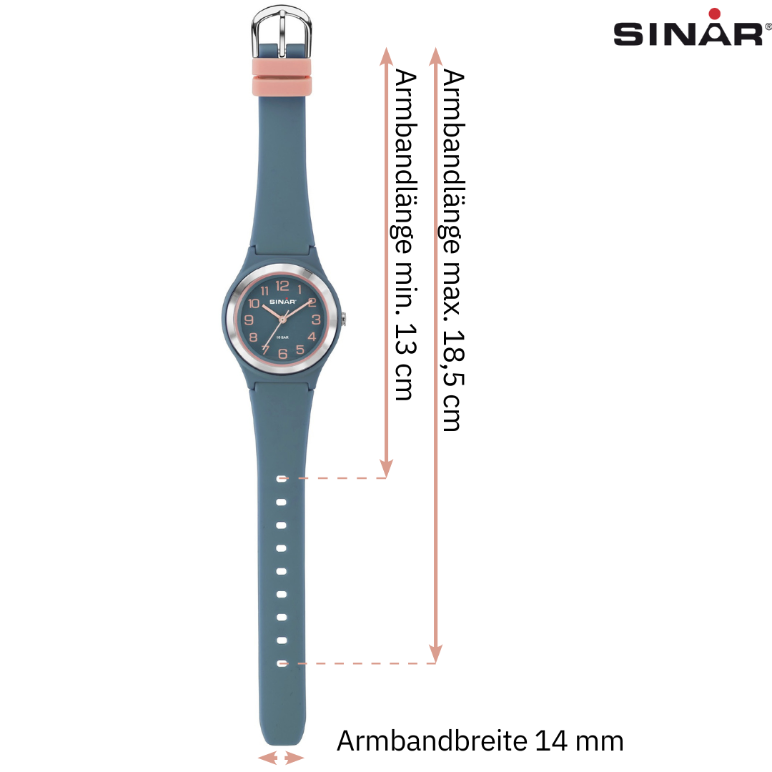 Mit einem Gehäusedurchmesser von 36 Millimeter und einer Höhe von 10 Millimeter schmiegt sich die Uhr angenehm an den Arm. Das cleane und sehr übersichtliche Display mit farbigen Kontrastziffern ist sehr gut ablesbar und damit perfekt geeignet für den Schulalltag; 10 bar Wasserdichtigkeit für alle Outdoor-Abenteuer oder sportliche Aktivitäten. Das weiche, hautverträgliche Silikonband garantiert Tragekomfort in jeder Situation. Das Armband ist 14 Millimeter breit und für einen Armumfang von 13 bis 18,5 Zentimeter geeignet. Die Lieferung erfolgt in der SINAR Geschenkbox und eignet sich somit bestens als Geschenk für alle Anlässe wie z.B. Geburtstag, Ostern oder Weihnachten.