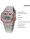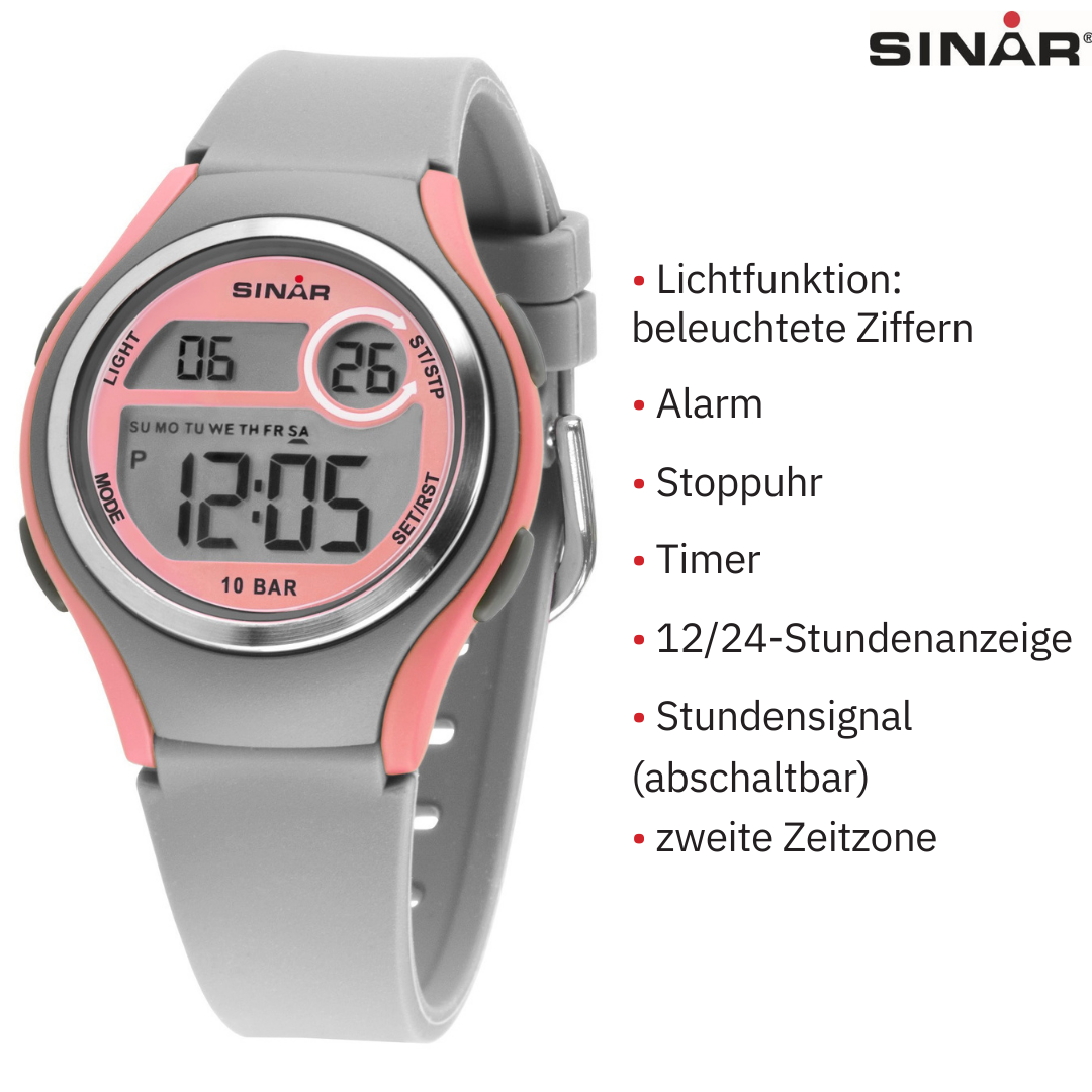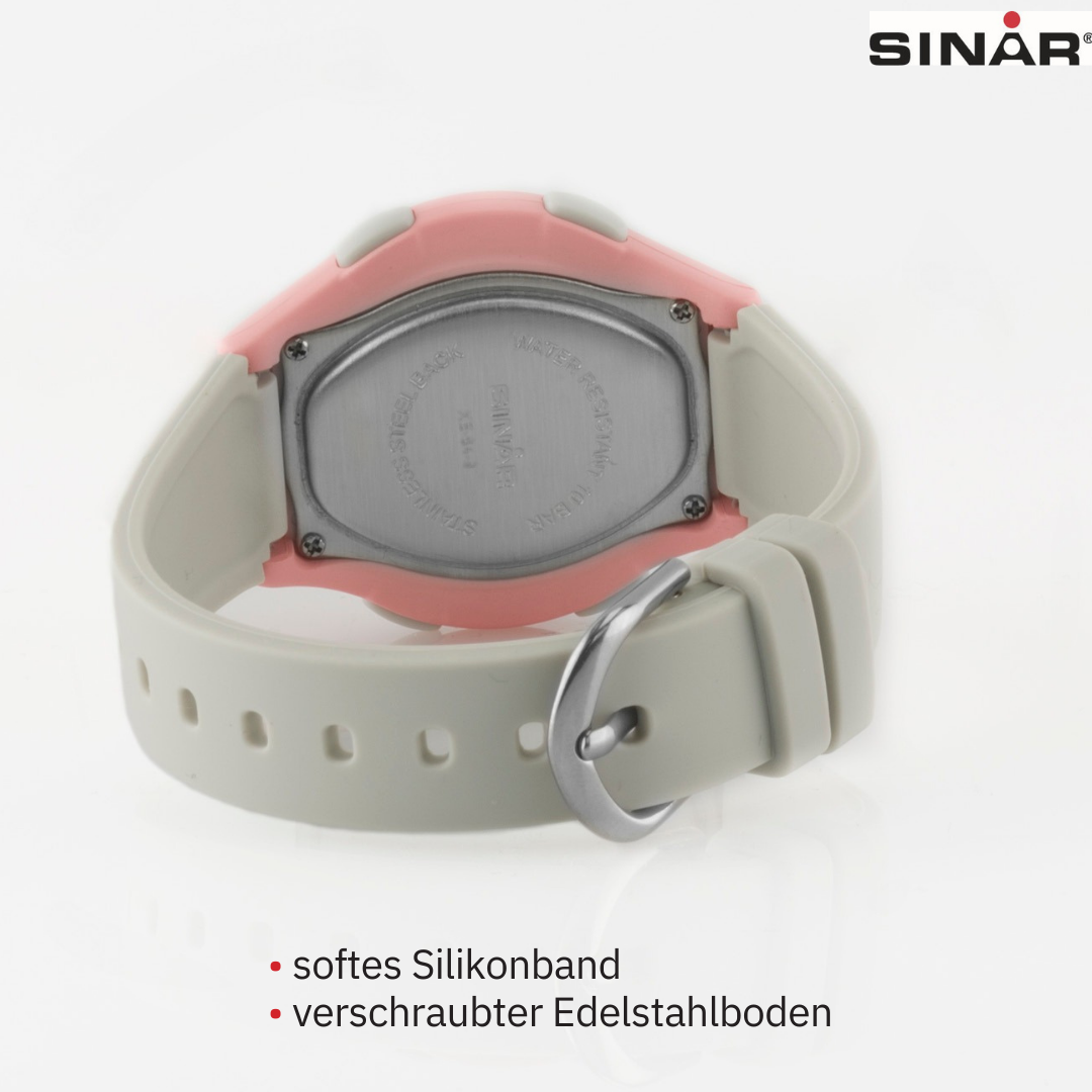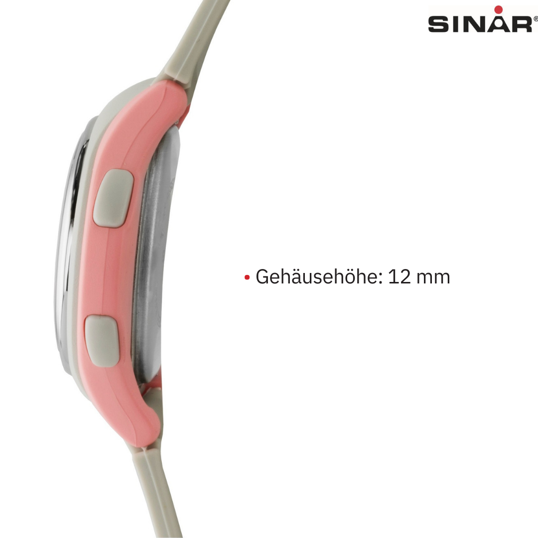 Ihre sportliche Coolness mit der trendy Kombination aus Hellgrau und Hellrosa und ihr super angenehmer Tragekomfort machen die digitale SINAR Uhr XE-64-9 zu einem absoluten Lieblingsbegleiter.