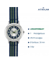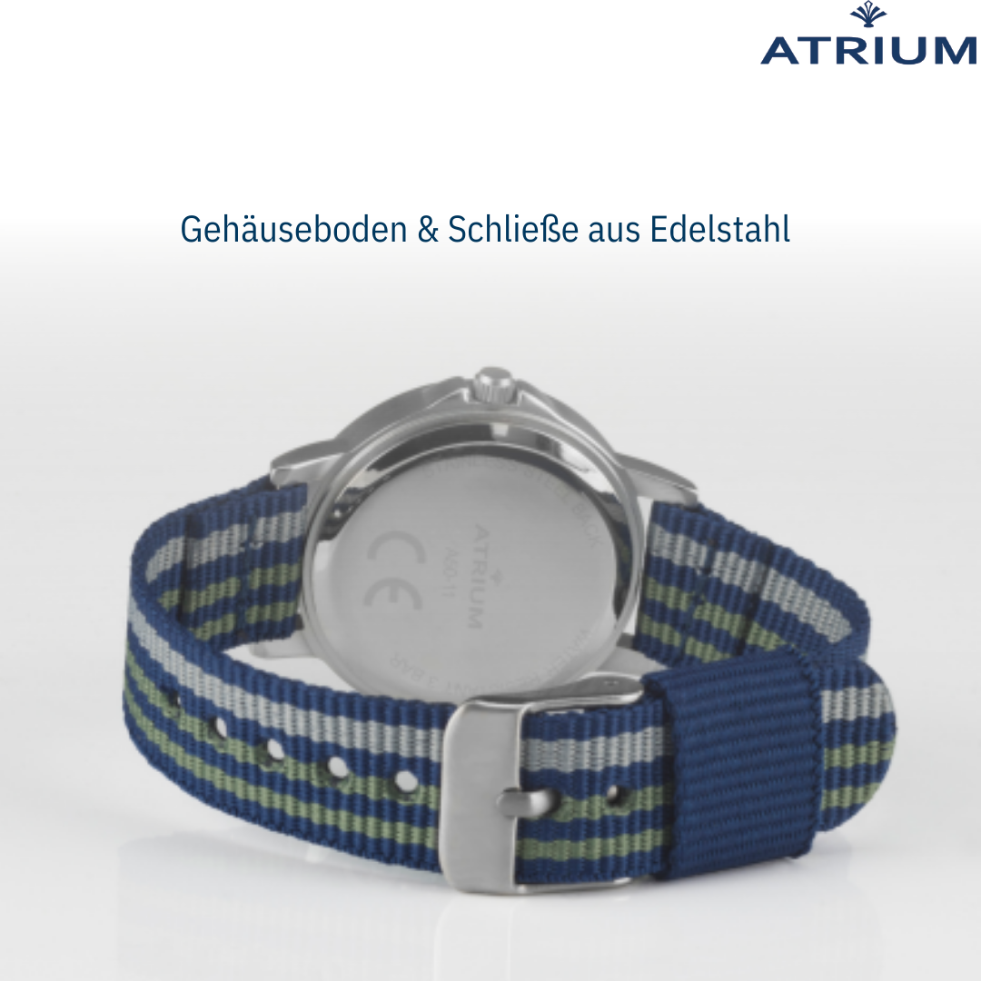 Das gestreifte Armband der coolen Jungsuhr A50-11 von ATRIUM macht diese zu einem stylischen Accessoire am Handgelenk. Zudem hat die Uhr ein übersichtliches Lernzifferblatt, das das Uhrzeit Lernen und Ablesen vereinfacht. Das silberfarbene Metallgehäuse hat einen Durchmesser von 30 Millimeter und ist 8 Millimeter hoch. Die Uhr ist mit einem Mineralglas und 3 bar Wasserdichtigkeit auch gut vor Spritzwasser geschützt. Gehäuseboden, Krone und Bandschließe sind aus Edelstahl gefertigt. Das übersichtliche Zifferblatt mit großen Ziffern, 24h-Beschriftung, Minuteneinteilung und kontrastfarbenen Zeigern lässt sich gut ablesen und ist dadurch perfekt geeignet für den Schulalltag. Das bunt gestreifte Nylonband ist robust genug, um dem Alltag Stand zu halten und gleichzeitig angenehm weich auf der Haut zu tragen. Das Armband ist 14 Millimeter breit und für einen Armumfang von 13 bis 17,5 Zentimeter geeignet. Für eine präzise analoge Zeitanzeige sorgt das japanische Quarzwerk.