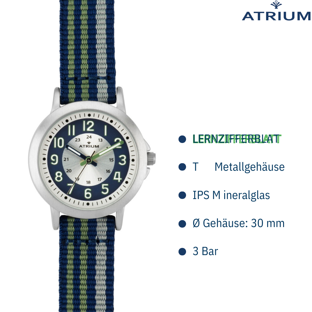 ATRIUM Uhr - Kinder - Jungen - Blau & Grün & Grau - Analog - 3 Bar - Lernzifferblatt - Nylonband
