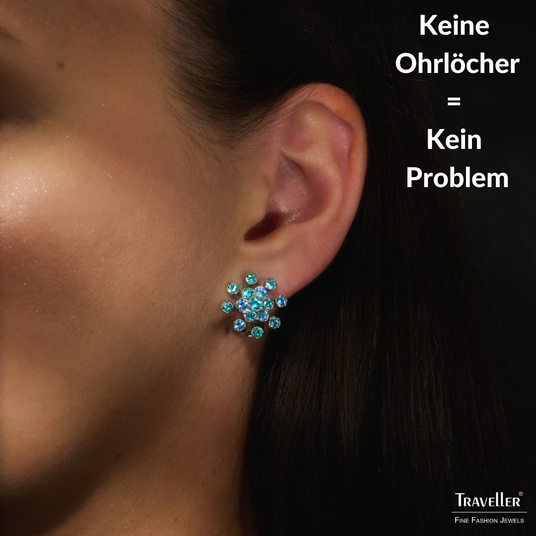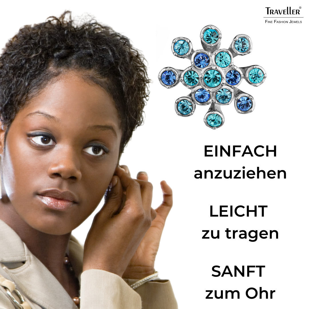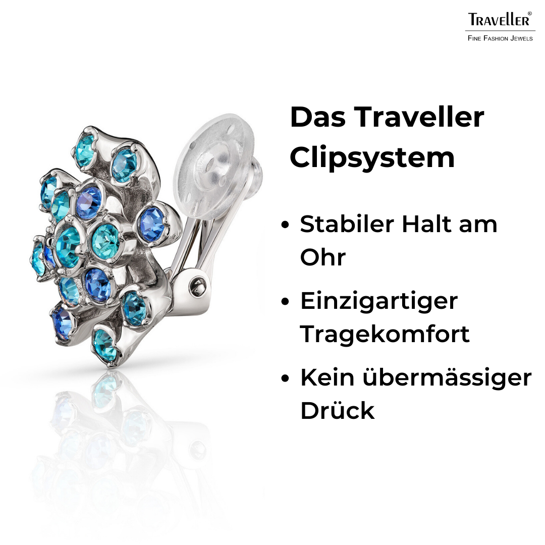 Diese funkelnden, farbenfrohen Ohrclips von Traveller haben die Form einer Blume. Die platinierten Ohrringe sind mit Preciosa Kristallen in verschiedenen Blautönen besetzt. Die Ohrringe haben einen Durchmesser von 17 Millimetern und wiegen jeweils nur 4 Gramm. Dank des einzigartigen Verschlusssystems von Traveller sind die Clips sehr bequem, leicht und sicher zu tragen.