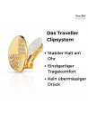 Ein elegantes Design mit funkelnden Kristallen. Diese Traveller-Clips in runder Form sind in vier Fächer unterteilt. Zwei davon sind mit Preciosa Kristallen besetzt. Die Ohrringe (Kernmaterial: Metall) sind mit 22 Karat Gold vergoldet, haben einen Durchmesser von 17 Millimetern und wiegen jeweils 3,5 Gramm. Dank des einzigartigen Verschlusssystems von Traveller sind diese Clips sehr bequem, leicht und sicher zu tragen.