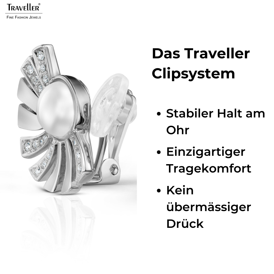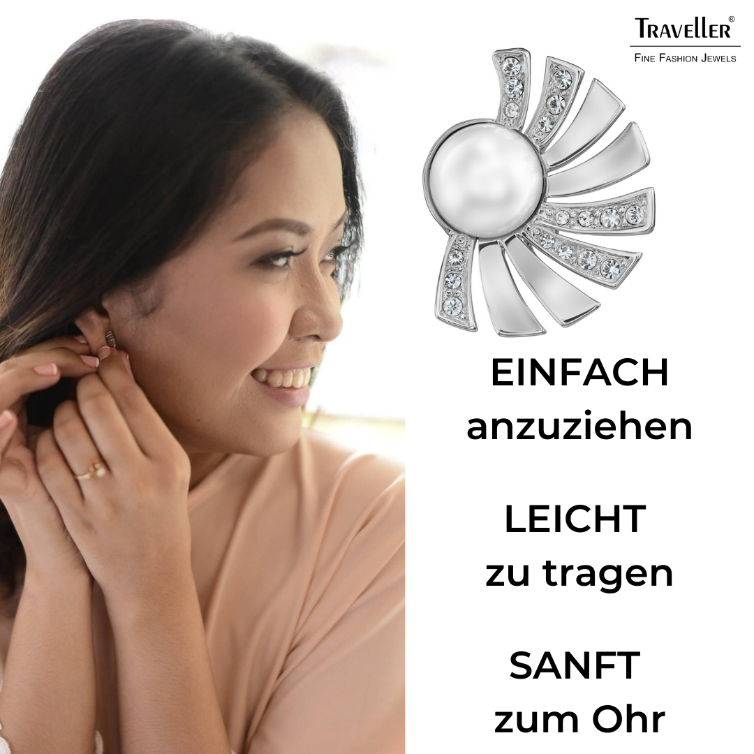 Diese charismatischen Ohrringe von Traveller haben die Form eines Fächers. Der erste, zweite, fünfte, sechste und neunte Fächer ist mit Preciosa-Kristallen besetzt, während die übrigen Fächer silberfarben glänzen. In der Mitte des Fächers befindet sich eine hochwertige Perlenimitation. Die Perlen stammen von der Insel Mallorca, die für ihre Perlen bekannt ist. Die Ohrringe sind platiniert (Kernmetall) und wiegen jeweils nur 3,5 Gramm. Dank des einzigartigen Verschlusssystems von Traveller sind diese Ohrclips sehr bequem, leicht und sicher zu tragen.