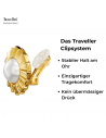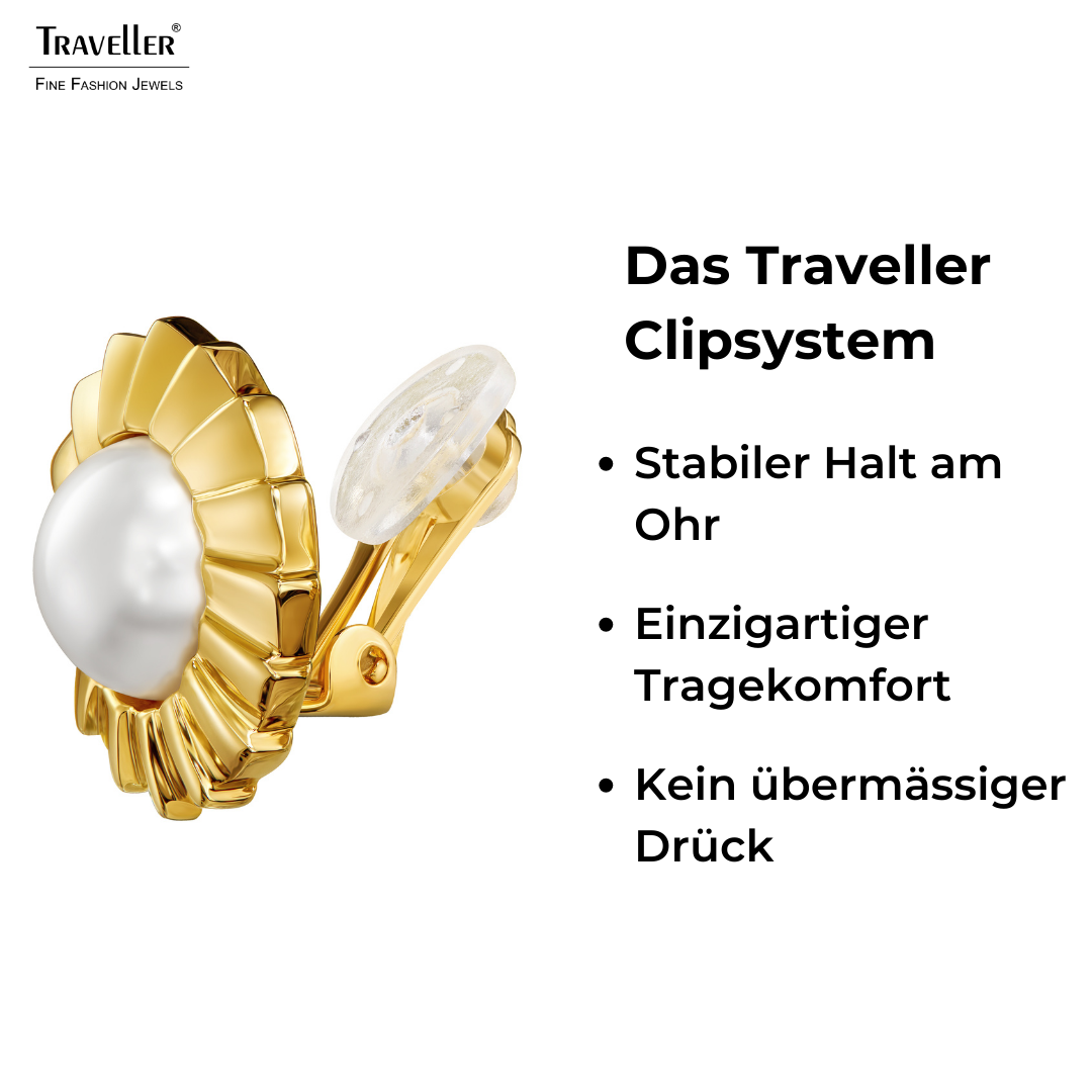 Elegant sind diese Ohrclips von Traveller. Diese Ohrclips haben die Form einer Blume. Glänzende, goldfarbene, rechteckige Blätter zieren den äußeren Rand und das Herz ist eine wunderschöne weiße Perlenimitation aus Mallorca - einer Insel, die für ihre hochwertigen Perlen bekannt ist. Die stilvollen Ohrclips haben einen Durchmesser von 19 Millimetern und wiegen jeweils 4,5 Gramm. Dank des einzigartigen Verschlusssystems von Traveller sind die Clips sehr bequem, leicht und sicher zu tragen. Die Ohrringe sind in einer Geschenkbox aus umweltzertifiziertem Material verpackt.