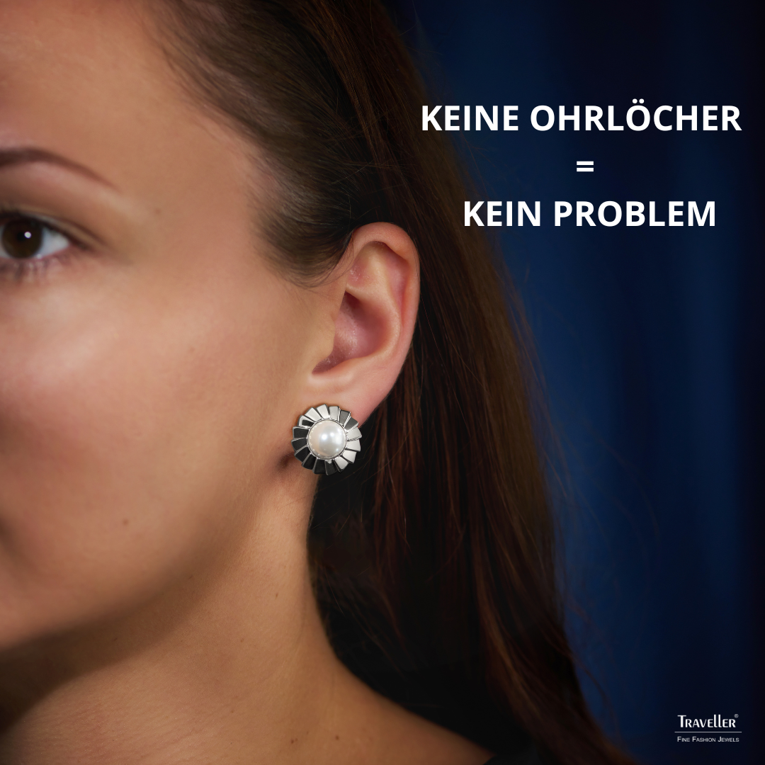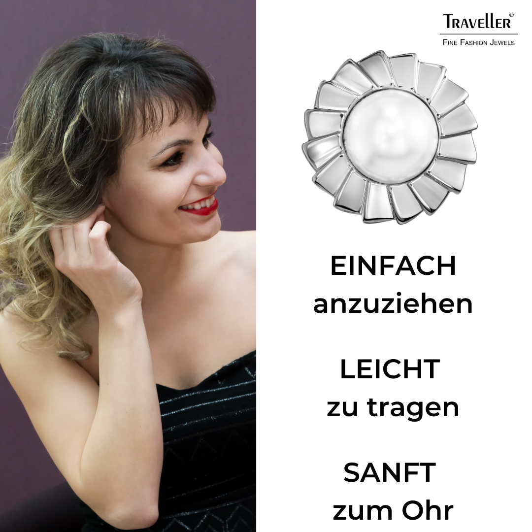 Elegant sind diese Ohrclips von Traveller. Diese Ohrclips haben die Form einer Blume. Glänzende, silberfarbene, rechteckige Blätter zieren den äußeren Rand und das Herz ist eine wunderschöne weiße Perlenimitation aus Mallorca - einer Insel, die für ihre hochwertigen Perlen bekannt ist. Die stilvollen Ohrclips haben einen Durchmesser von 19 Millimetern und wiegen jeweils 4,5 Gramm. Dank des einzigartigen Verschlusssystems von Traveller sind die Clips sehr bequem, leicht und sicher zu tragen. Die Ohrringe sind in einer Geschenkbox aus umweltzertifiziertem Material verpackt.