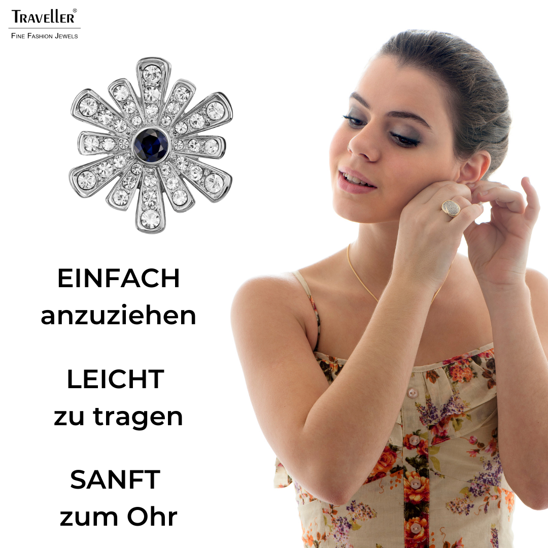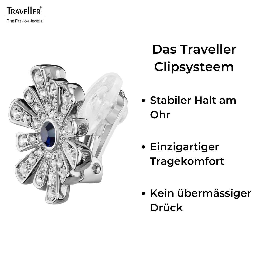 Dieses Paar schöner Ohrringe von Traveller ist ein echter Blickfang. Ein blauer, dunkelindigoblauer Kristall bildet das Herz einer Blume. Die Blütenblätter dieser plattierten Ohrclips sind mit Preciosa-Kristallen besetzt. Pro Stück wiegen die Ohrringe nur 2 Gramm und dank des einzigartigen Verschlusssystems von Traveller sind sie sehr leicht, bequem und sicher zu tragen.