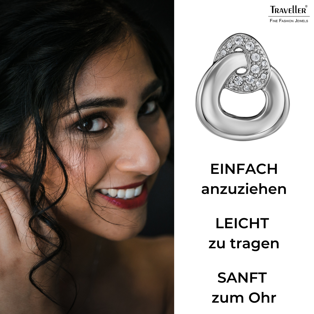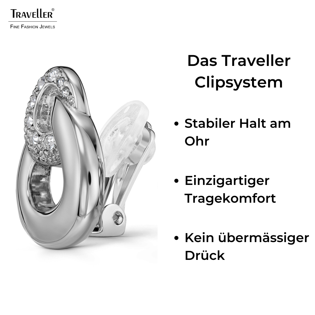 Strahlen Sie mit diesen trendigen Ohrringen von Traveller! Die platinierten Ohrclips bestehen aus 2 runden Dreiecken. Das obere ist mit Kristallen von Preciosa besetzt, im Inneren dieses Dreiecks hängt ein größeres, silbern glänzendes Dreieck. Die Ohrclips sind 20 mal 17 Millimeter groß und wiegen jeweils 3,75 Gramm. Dank des einzigartigen Verschlusssystems von Traveller sind diese Ohrclips sehr bequem, leicht und sicher zu tragen.