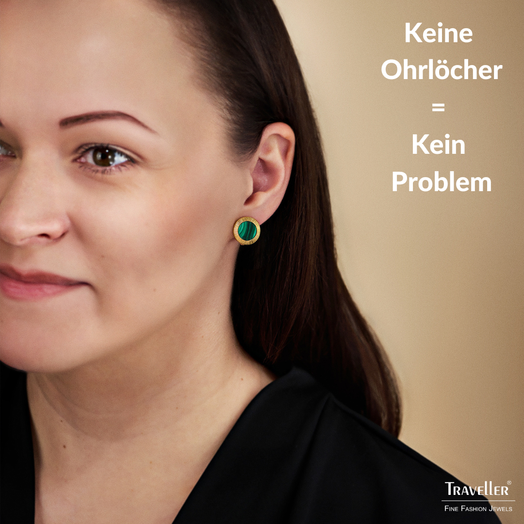 Traveller Ohrclips - 22kt Vergoldet - Echter Malachit - Grün - Ø 15 mm - Einzigartig - 112508