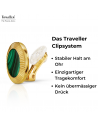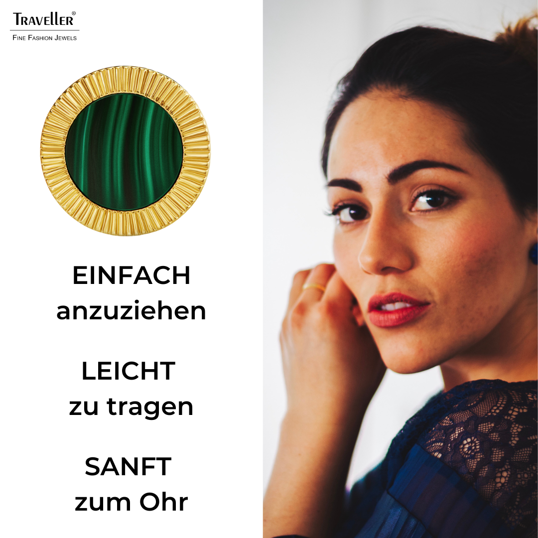 Diese stilvollen Ohrringe von Traveller sind mit einem wunderschönen echten Malachitstein besetzt. Die Ohrclips sind mit 22 Karat Gold vergoldet und enthalten einen echten gesprenkelten Malachitstein, der von einem schattierten Goldrand umgeben ist. Malachit ist ein Naturprodukt, daher kann die Farbe auf dem Foto von der Farbe der Ohrclips, die Sie erhalten, abweichen, da jeder Stein einzigartig ist und daher etwas anders aussieht. Die Ohrclips haben einen Durchmesser von 11 Millimetern und wiegen jeweils nur 1,5 Gramm. Dank des einzigartigen Verschlusssystems von Traveller sind diese Ohrclips sehr bequem, leicht und sicher zu tragen.