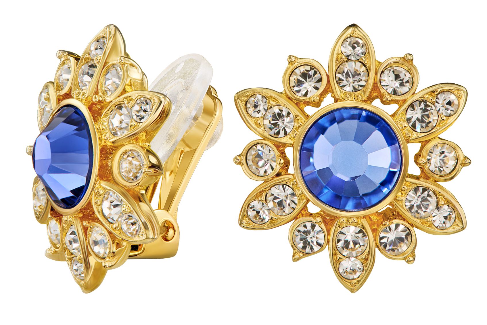 Dieses Paar schöner Ohrringe von Traveller ist ein echter Blickfang. Ein blauer Kristall bildet das Herz einer Blume. Die Blütenblätter dieser vergoldeten Ohrclips sind mit Preciosa-Kristallen besetzt. Pro Stück wiegen die Ohrringe nur 3 Gramm und sind dank des einzigartigen Verschlusssystems von Traveller sehr leicht, bequem und sicher zu tragen.