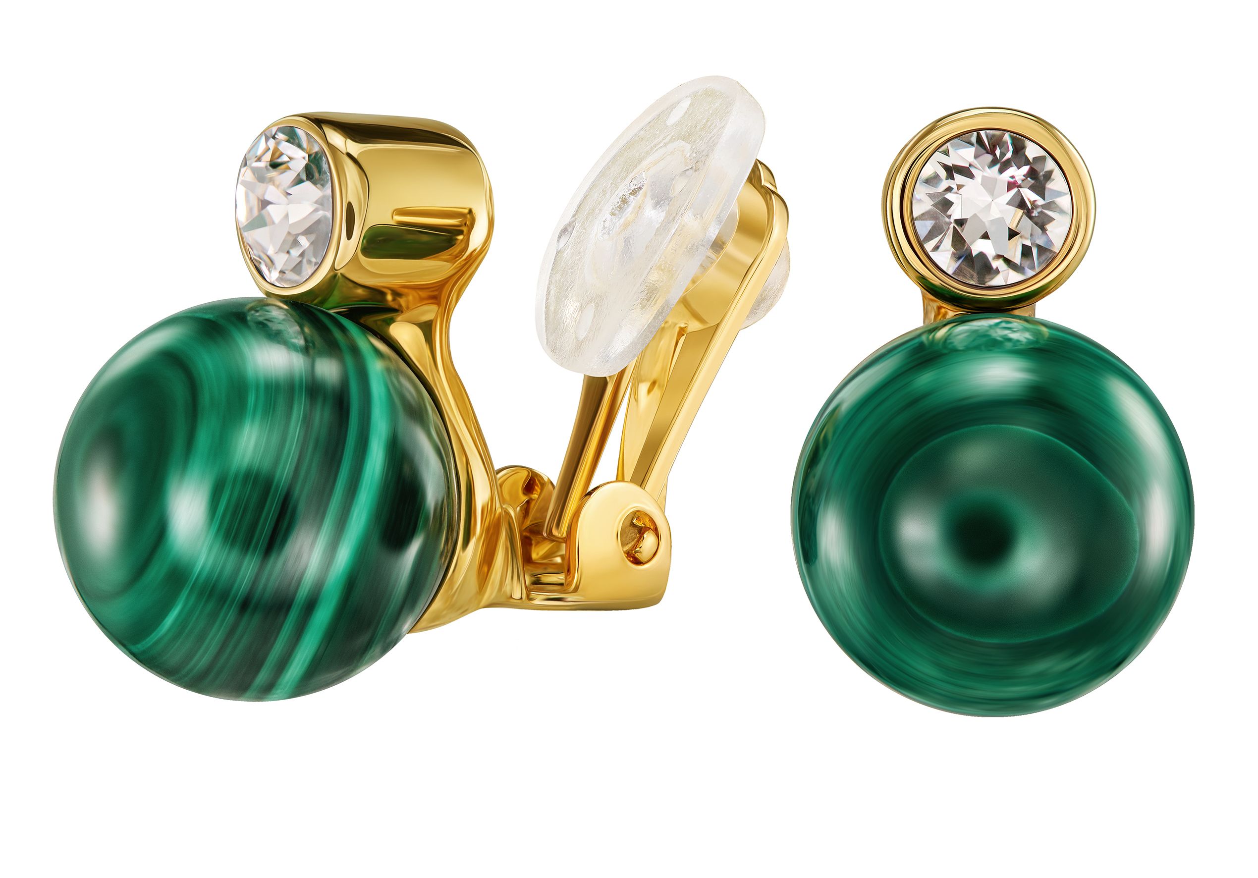 Der klassische runde Traveller-Ohrring verbindet Harmonie mit Eleganz. Die vergoldeten Clips enthalten einen echten, wunderschön gesprenkelten Malachitstein mit einem Durchmesser von 10 Millimetern, über dem ein Peciosa-Kristall funkelt. Malachit ist ein Naturprodukt, daher kann die Farbe auf dem Foto von der Farbe des Ohrrings, den Sie erhalten, abweichen. Jeder Stein ist einzigartig und sieht daher etwas anders aus. Dank des einzigartigen Verschlusssystems von Traveller sind diese Ohrclips sehr bequem, leicht und sicher zu tragen.