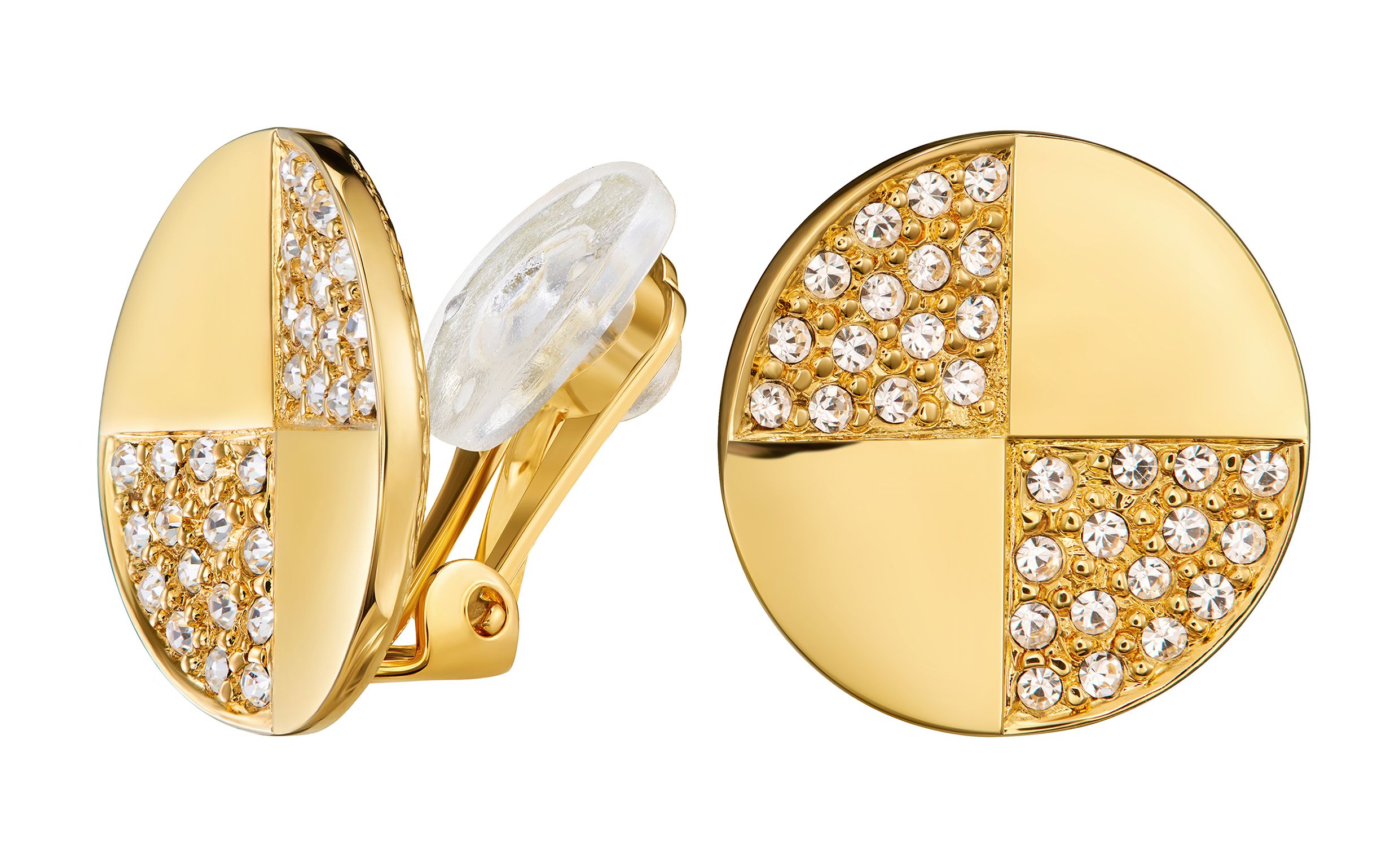 Ein elegantes Design mit funkelnden Kristallen. Diese Traveller-Clips in runder Form sind in vier Fächer unterteilt. Zwei davon sind mit Preciosa Kristallen besetzt. Die Ohrringe (Kernmaterial: Metall) sind mit 22 Karat Gold vergoldet, haben einen Durchmesser von 17 Millimetern und wiegen jeweils 3,5 Gramm. Dank des einzigartigen Verschlusssystems von Traveller sind diese Clips sehr bequem, leicht und sicher zu tragen.