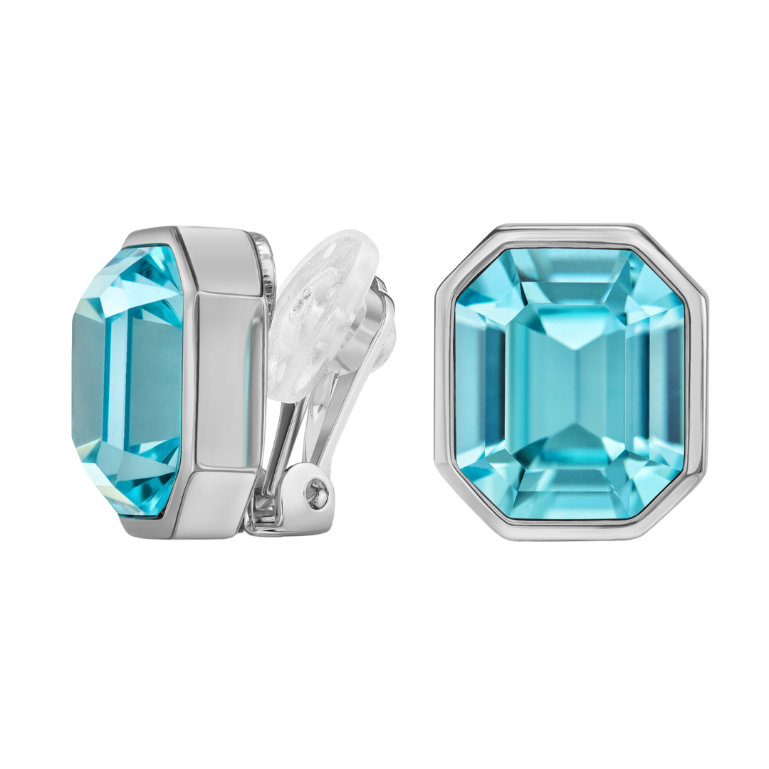 Ein Paar modische, blitzende und vor allem funkelnde Ohrclips von Traveller. Der Ohrring besteht aus einem schönen rechteckigen hellblauen Preciosa-Kristall, der von einem silbernen Rand umrahmt ist. Diese Kristalle werden aus den feinsten Rohstoffen aus der tschechischen Region hergestellt und sind unübertroffen in Qualität und Brillanz. Jeder Stein wird in sorgfältiger Handarbeit nach uralten Glasbläsertechniken aus natürlichem böhmischen Sand hergestellt, der für seinen Reichtum an Kieselsäure und Siliziumoxid bekannt ist. Die Ohrclips haben eine Größe von 14 x 12 Millimetern und sind plattiert. Dank ihres geringen Gewichts von 4,3 Gramm pro Stück und des einzigartigen Verschlusssystems von Traveller sind diese Ohrclips sehr bequem, leicht und sicher zu tragen.