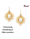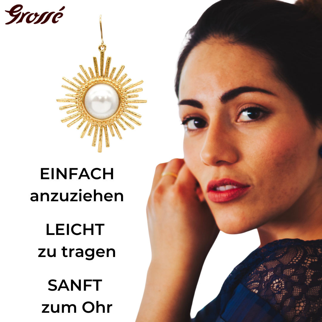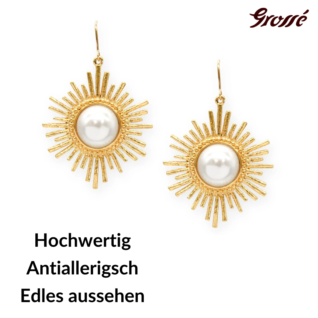 Future Floral von Grossé ist eine strahlende Schmucklinie mit einer glänzenden Perle als Herzstück. Diese Ohrringe haben die Form einer futuristischen Blume mit Blütenblättern in Form von Sonnenstrahlen. Die Ohrringe sind vollständig mit 22 Karat Gold vergoldet. Die goldfarbenen Ohrringe sind 4,7 mal 3 Zentimeter groß und wiegen jeweils 6,5 Gramm.