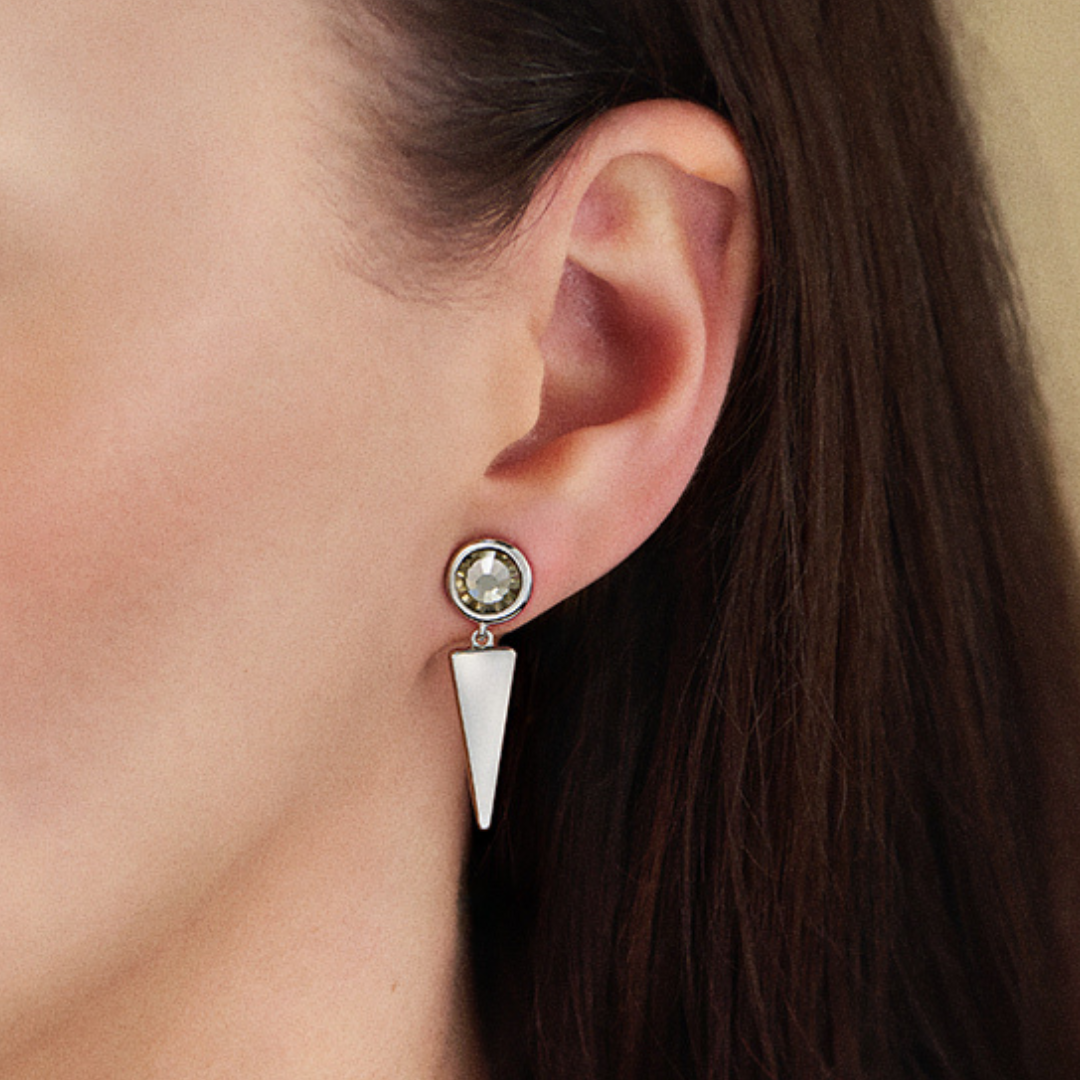 Dieses besondere Paar Ohrringe von Traveller passt zu jedem Outfit! Das Design ist auffällig und schlicht. Die Ohrringe bestehen aus einem wunderschönen schwarzer Kristall von Preciosa Crystals mit einem silberen Rahmen, an dem ein glänzendes silberen längliches Dreieck hängt. Die Ohrringe sind vollständig platiniert. Insgesamt messen die Ohrringe 35 x 10 Millimeter und wiegen jeweils nur 1,75 Gramm. Da die Ohrstecker aus antiallergischem Titan gefertigt sind, kann jeder diese Ohrringe (wieder) tragen!